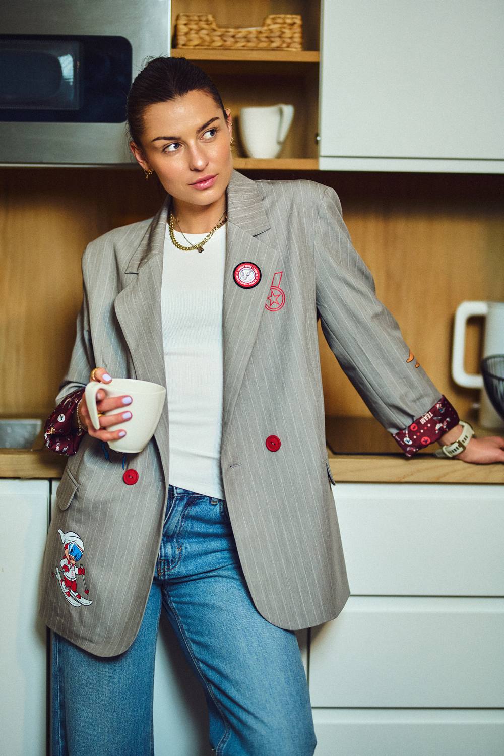 Marynarka One Team to najbardziej zaskakujący element kolekcji. Klasyczny szary prążek stał się tłem dla kolorowych postaci Bugs Bunny'ego i Tweety'ego, którzy kibicują polskiej reprezentacji.