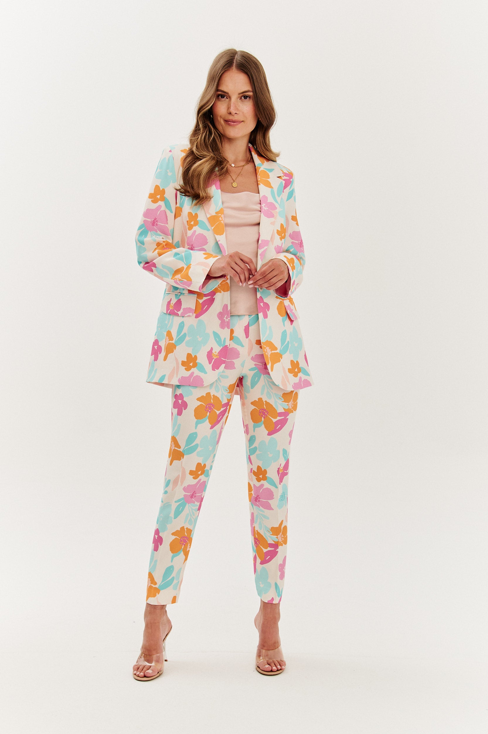 Zachwyć świeżością kolorów i wiosenną energią – marynarka Painted Memories to propozycja, która przyciąga wzrok od pierwszego spojrzenia. Wyrazisty print w odcieniach pomarańczu, różu i turkusu na jasnym tle tworzy modowy miks, który ożywi każdą stylizację. Idealna do miejskich looków, wakacyjnych wyjazdów i biura z charakterem.