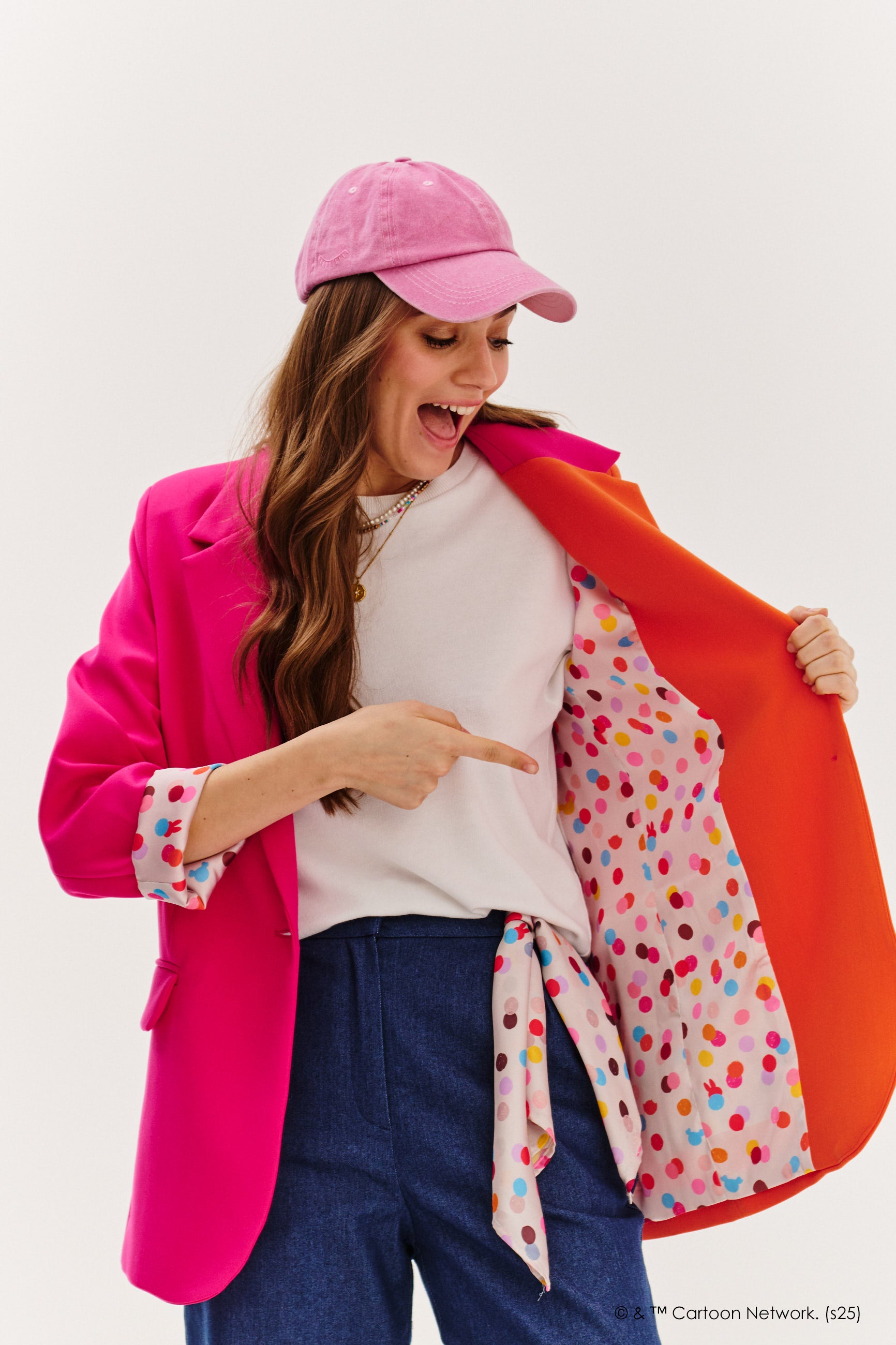 Marynarka Powerpuff Dots to odważne połączenie koloru, nostalgii i nowoczesnego kroju. Dwukolorowy design w energetycznym różu i pomarańczu przyciąga wzrok, a naszywki z logo Powerpuff Girls i bohaterkami serialu dodają jej niepowtarzalnego charakteru. W środku zaskakuje kontrastowa podszewka w kolorowe kropki – bo girl power to także zabawa i luz.