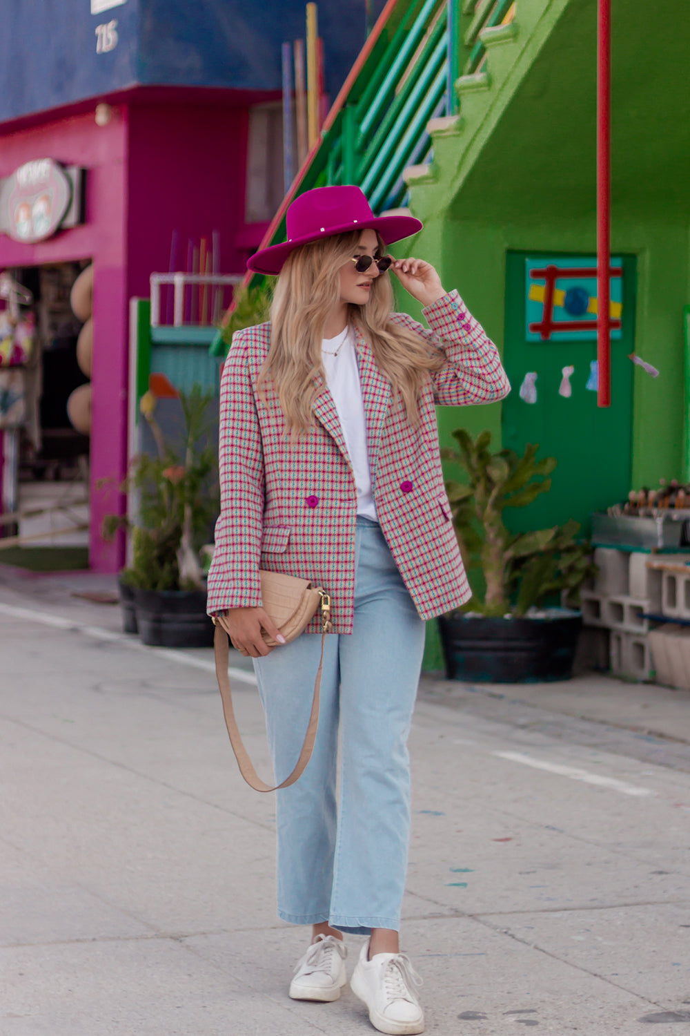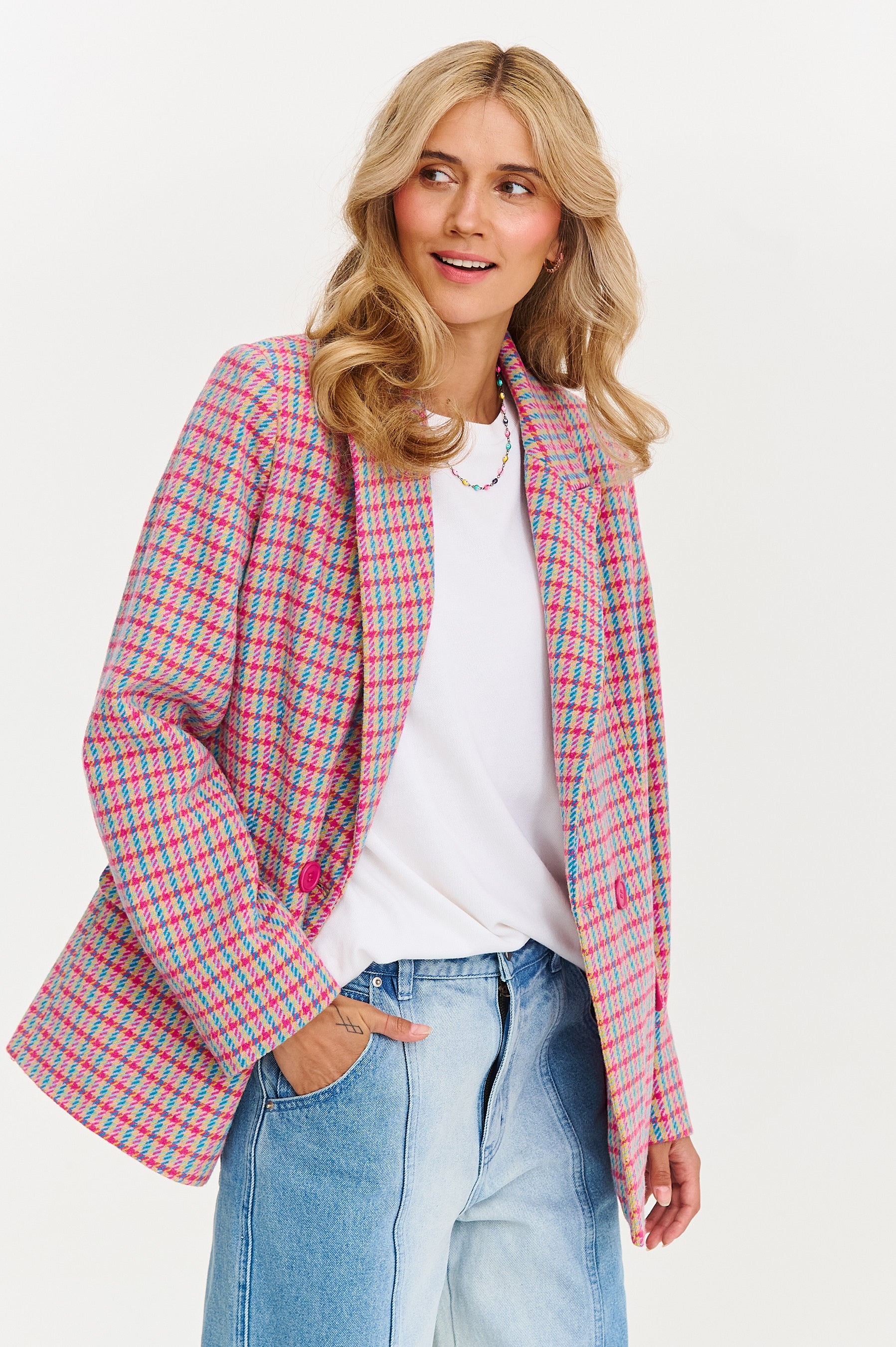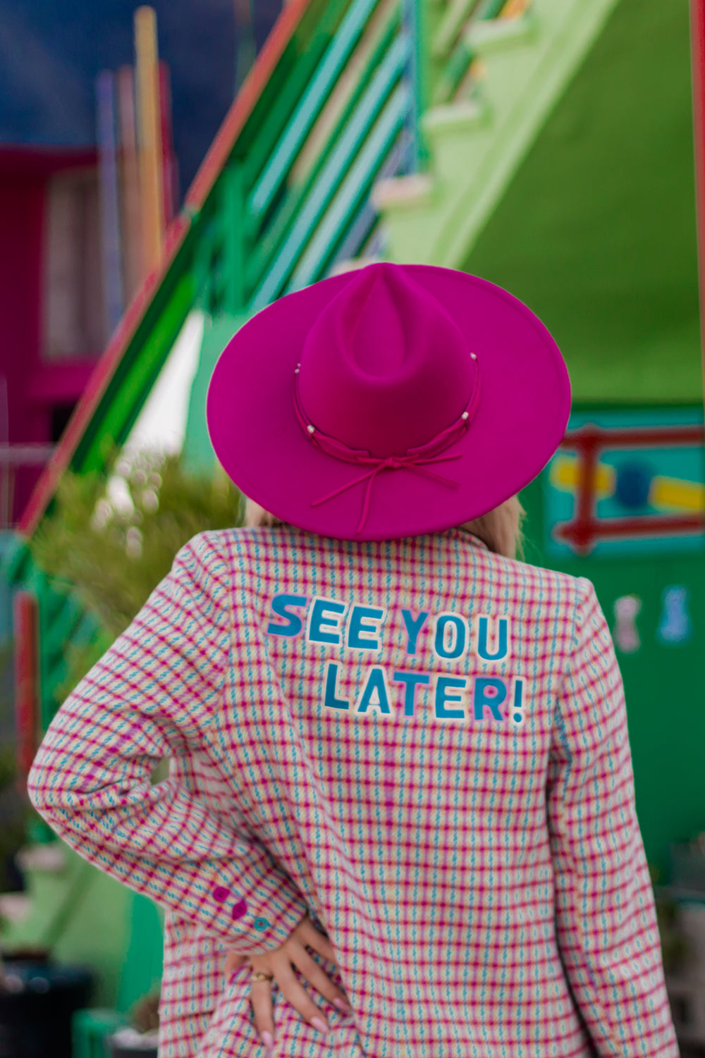 Marynarka See You Later to esencja radości zamknięta w formie klasycznego kroju. Kolorowa, energetyczna krata przyciąga wzrok i budzi dobre emocje, a mocny, różowy akcent podszewki i mankietów nadaje całości świeżości i charakteru. Na plecach znajdziesz wyjątkowy napis "SEE YOU LATER!", który sprawia, że ten model to coś więcej niż tylko modowy wybór – to manifest Twojej osobowości. Dodatek wełny sprawia, że ta marynarka to idealny wybór na chłodniejsze dni.