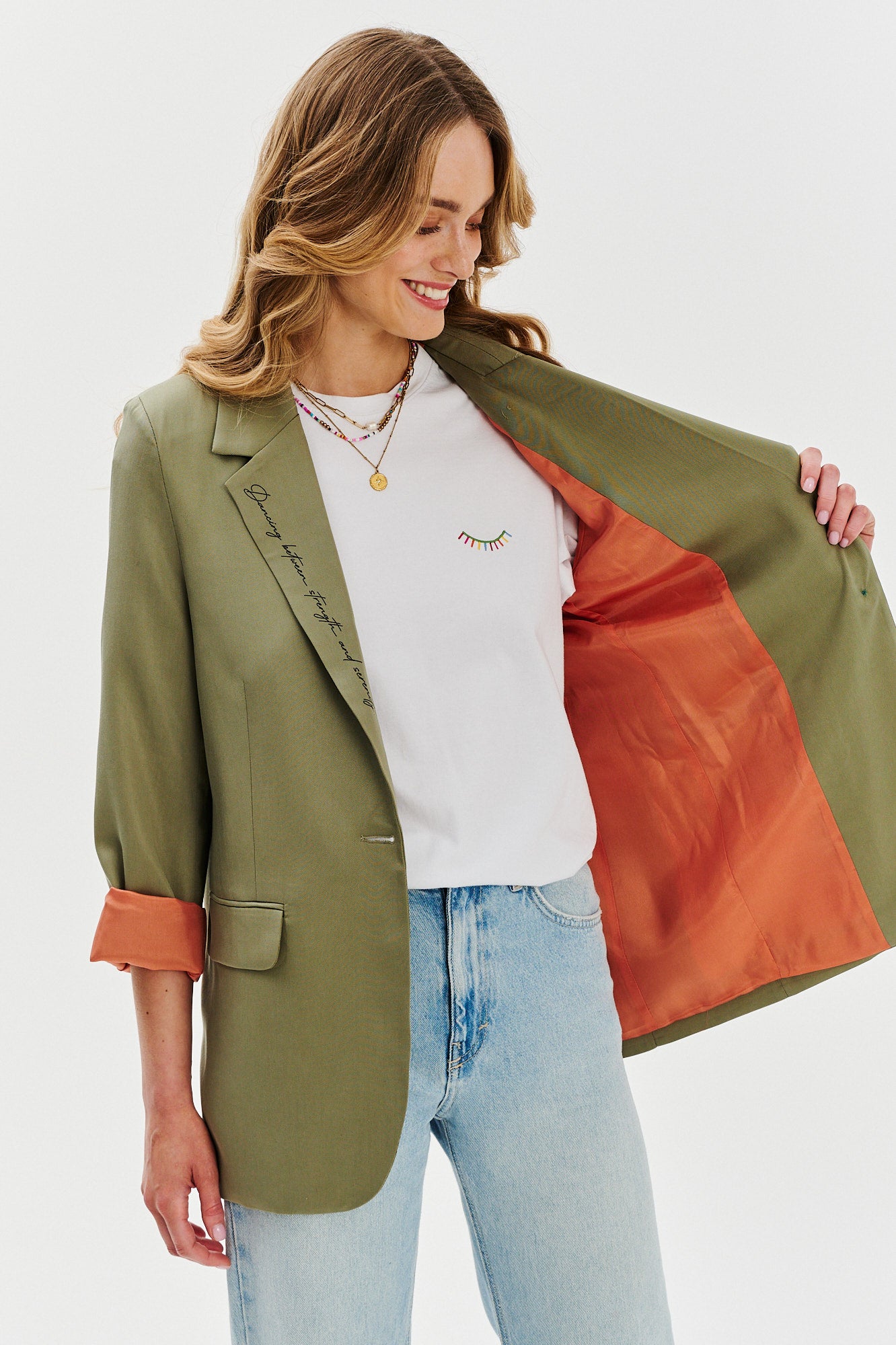 Gdy klasyczna forma spotyka się z wyrafinowaną paletą barw – powstaje coś wyjątkowego. Marynarka Serenity Rose to uosobienie spokoju i subtelnej siły. Głęboka zieleń przełamana brzoskwiniowym wnętrzem i wykończeniami tworzy duet, który przyciąga spojrzenia i koi zmysły.