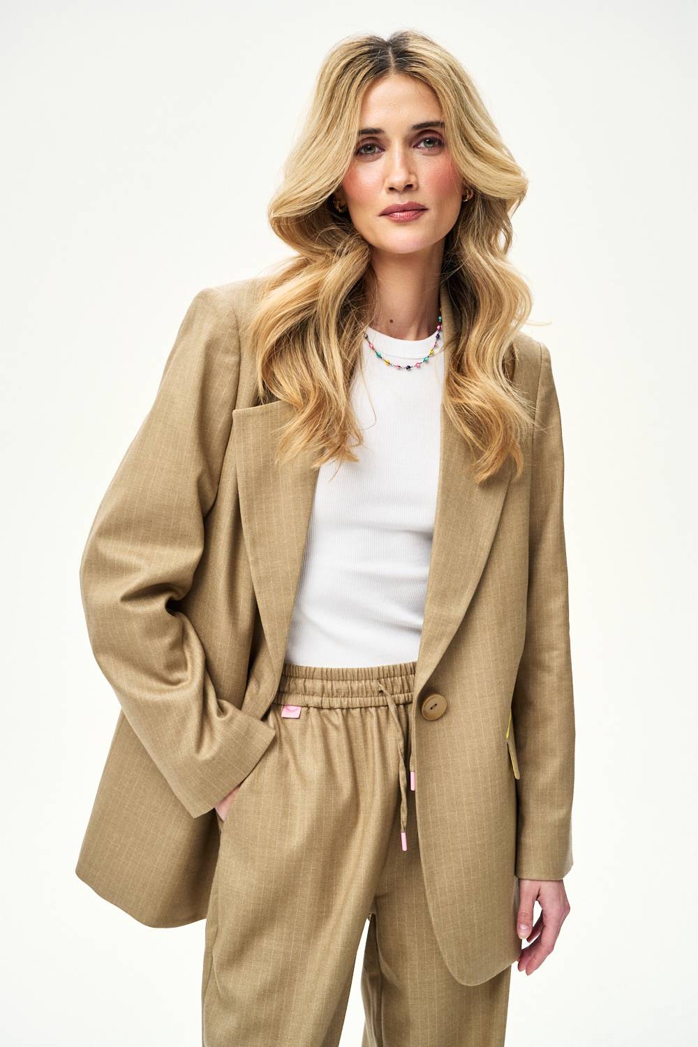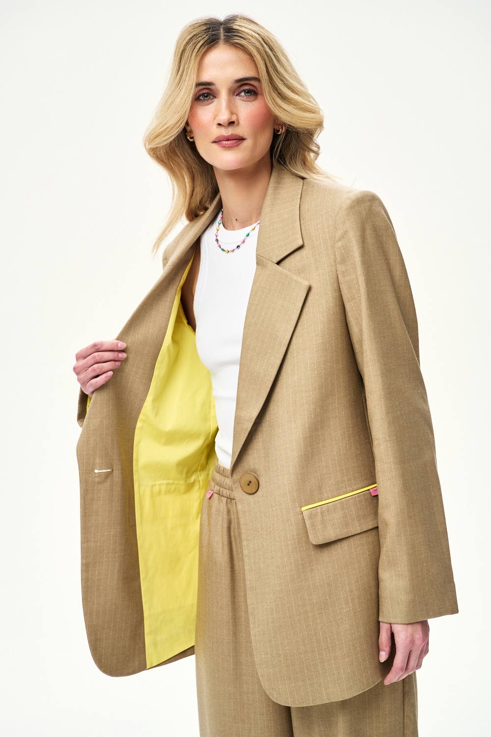 Marynarka Silent Spark to hołd dla tradycyjnego krawiectwa w kobiecym wydaniu. Wydłużony krój i pionowe linie optycznie wysmuklają sylwetkę, nadając jej nowoczesnej lekkości.