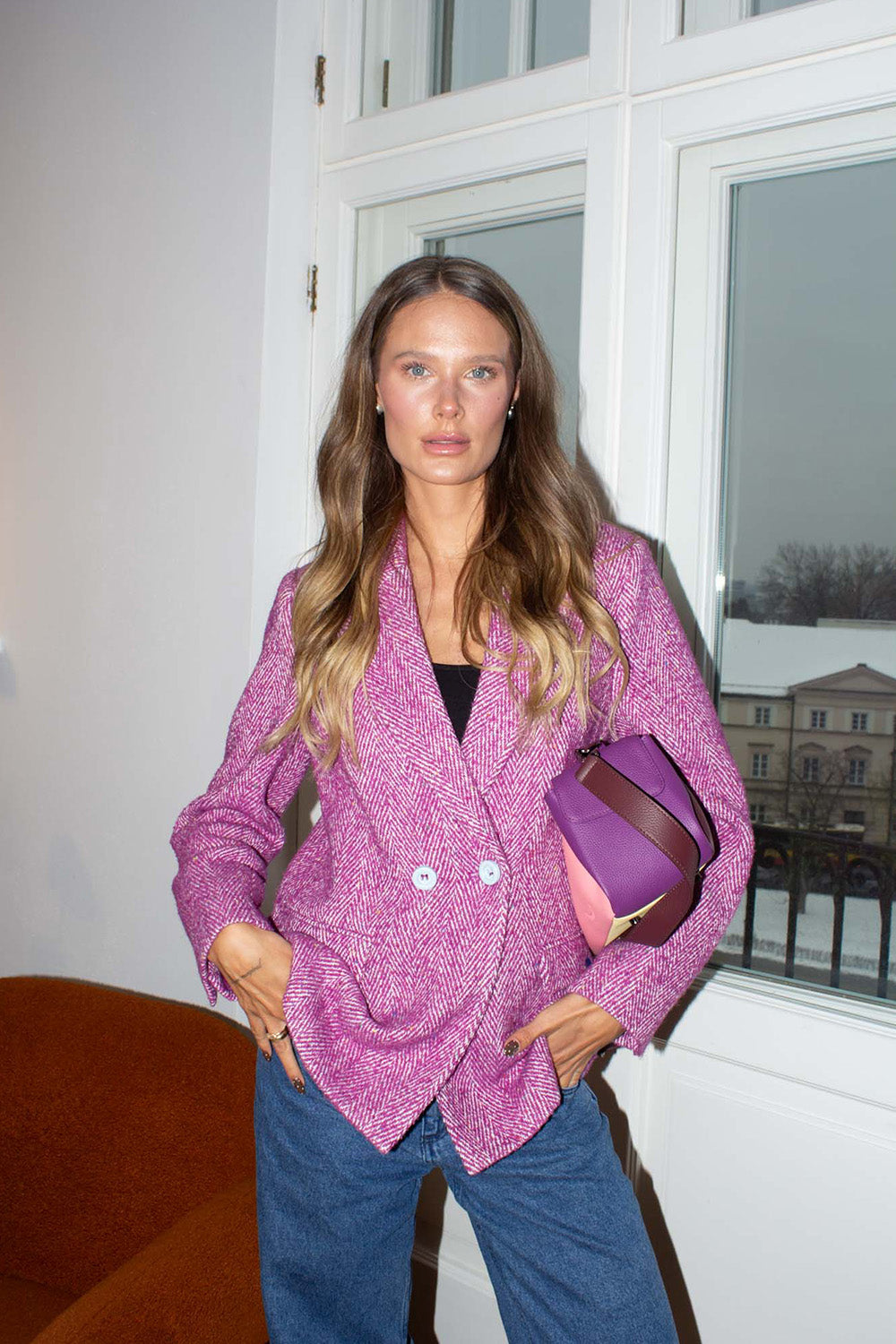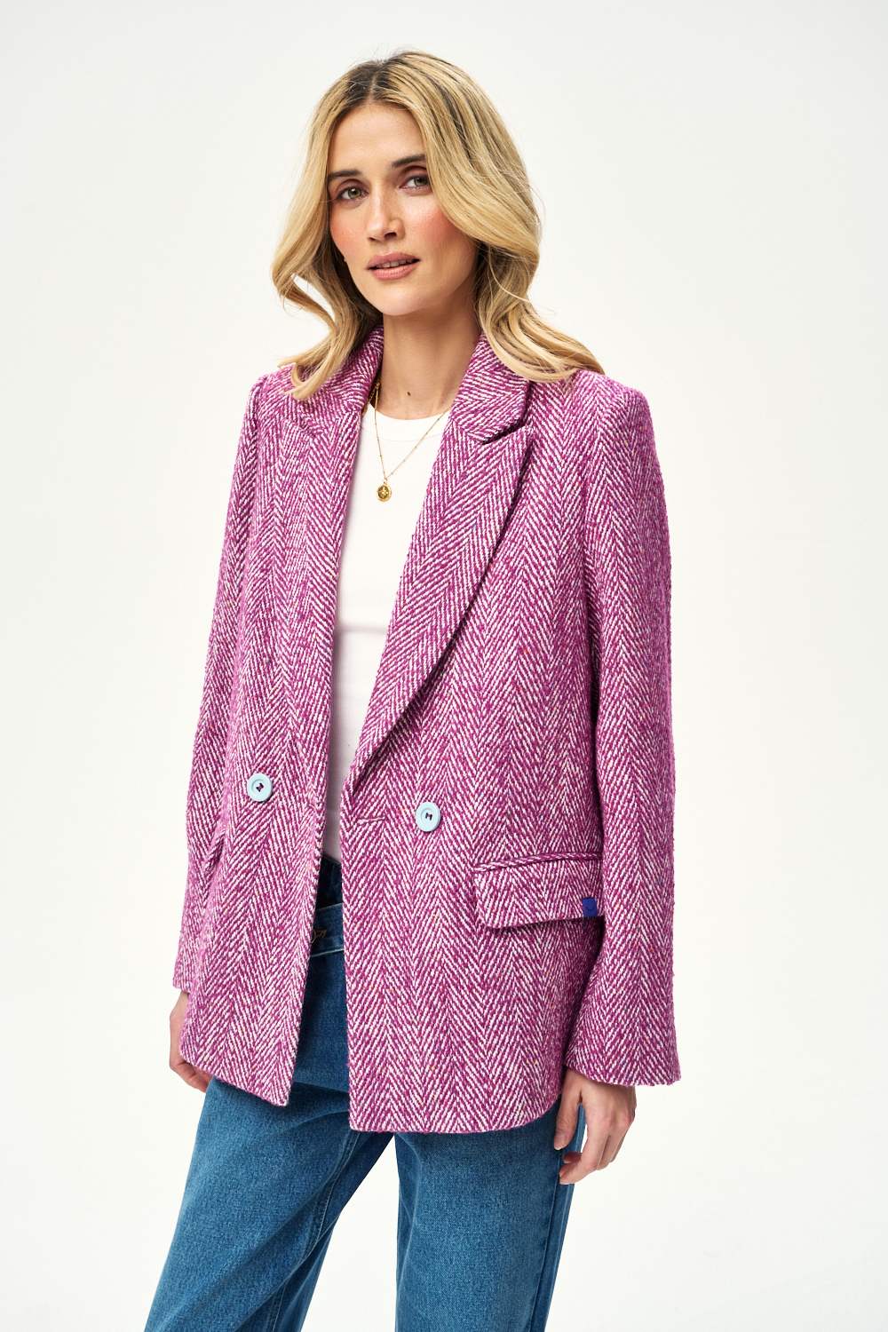 Marynarka Start Again udowadnia, że elegancja nie musi być nudna. To połączenie klasycznego wzoru w jodełkę z wesołym odcieniem fioletu. Kontrastujące, niebieskie guziki i metka na kieszeni dodają jej nowoczesnego sznytu.