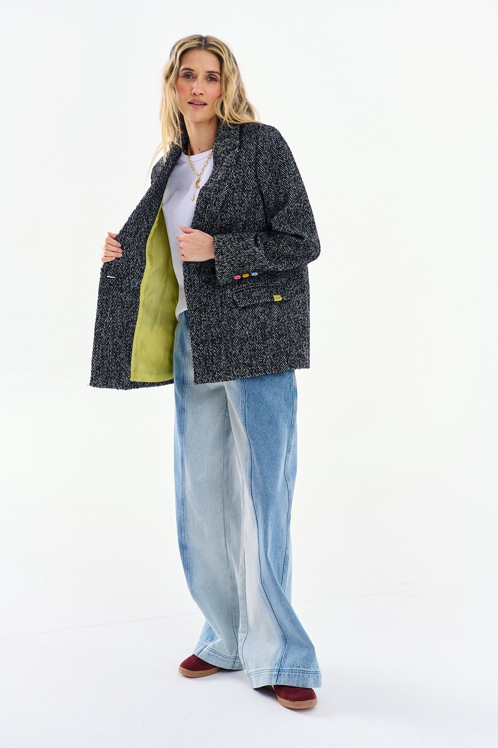Marynarka True Vision to hołd dla detalu. Klasyczny krój dwurzędowy w jodełkę został przełamany nowoczesnymi akcentami: wielobarwnymi guzikami i kolorowymi supełkami w strukturze materiału. Żółta podszewka to ukryty zastrzyk energii, który poczujesz przy każdym założeniu.