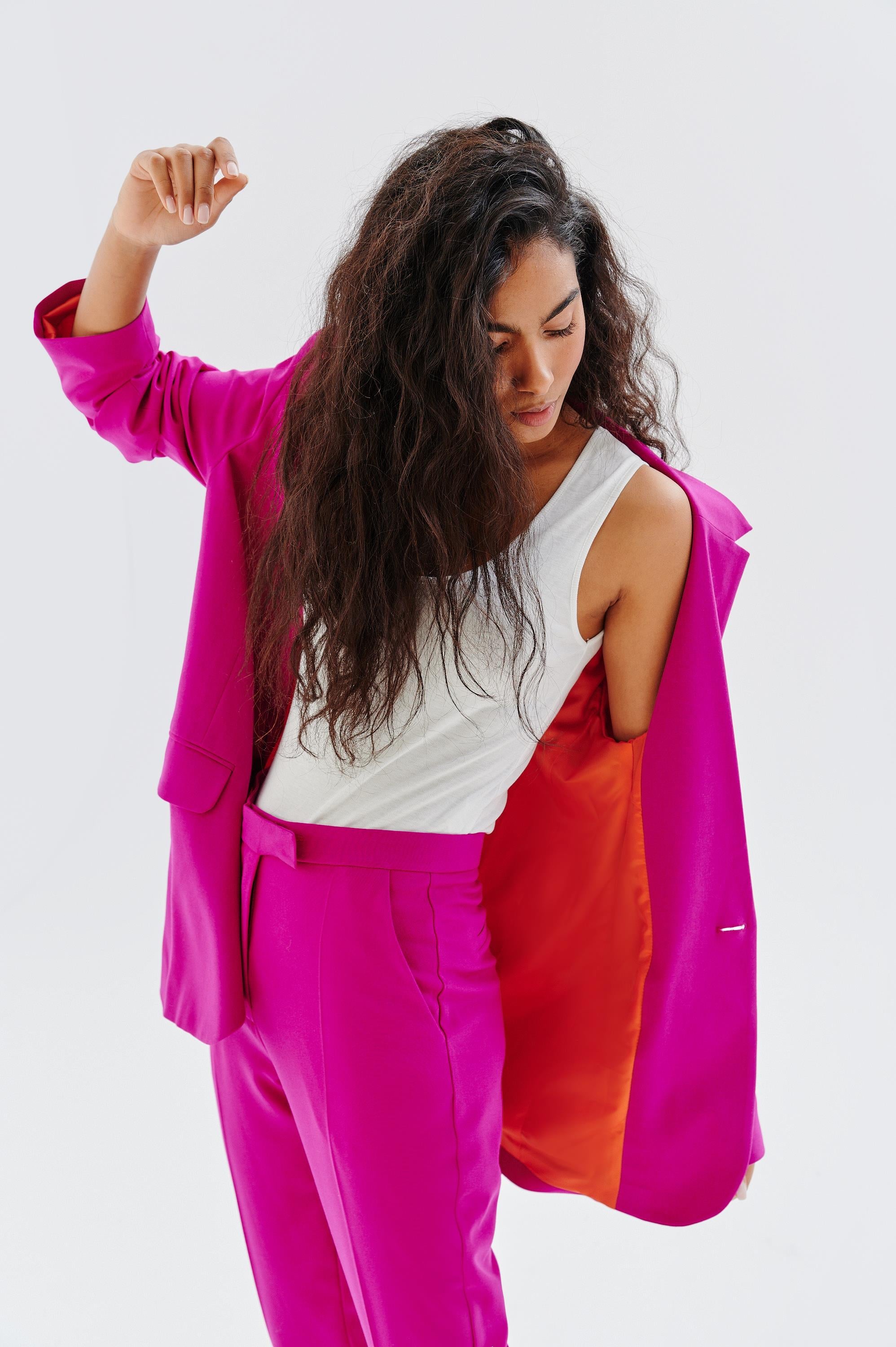 Marynarka Viva Magenta to mocny kolor w klasycznej formie, dzięki czemu otrzymujemy elegancką, ale niesztampową część garderoby. Prosta, klasyczna marynarka ma lekko oversizowy krój. Na tyle, by nie przylegać ściśle do ciała, a jednocześnie nie zniekształcać sylwetki.