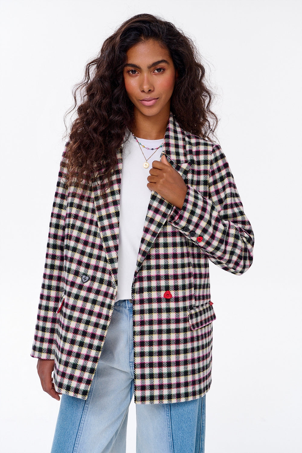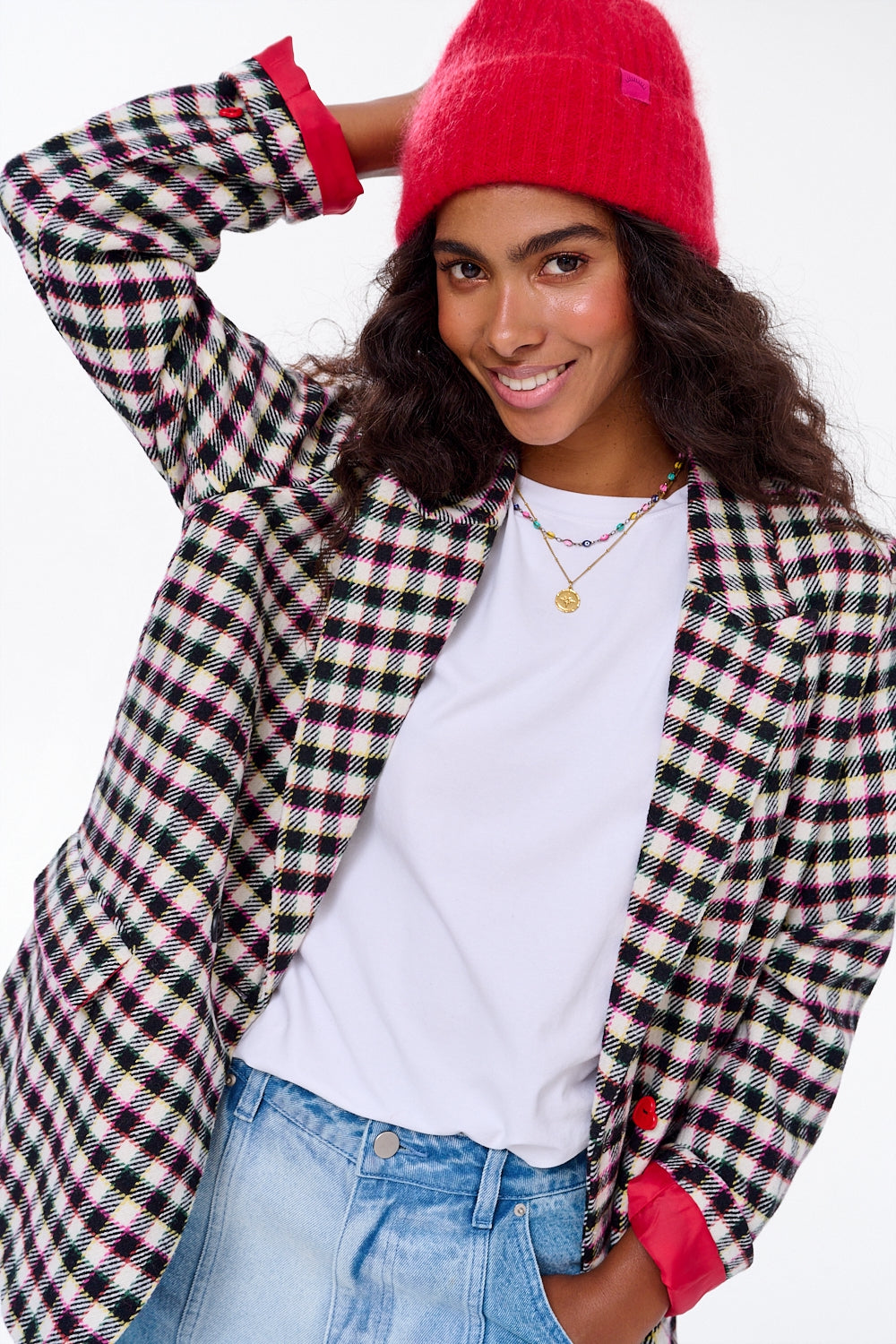 Marynarka Yes Please to klasyka w odważnym, nowoczesnym wydaniu. Jej kolorowa kratka w odcieniach czerni, bieli, różu i zieleni przyciąga spojrzenia i dodaje energii każdej stylizacji. Dzięki starannie dopracowanemu fasonowi marynarka pięknie układa się na sylwetce, a kontrastowa podszewka i czerwone guziki nadają jej charakteru z nutą zaskoczenia.