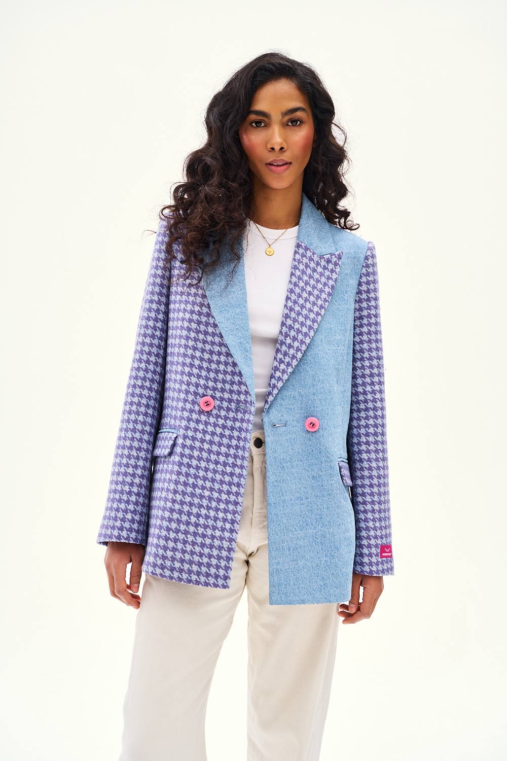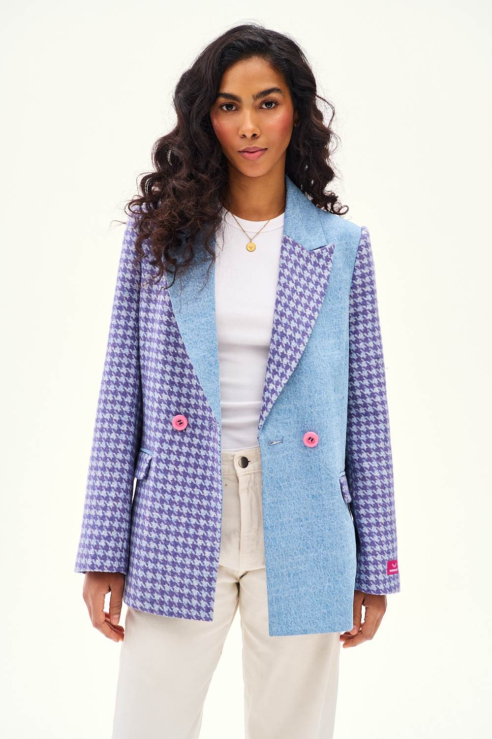 Marynarka z wełną After the Rain to dowód na to, że przeciwieństwa się przyciągają. Połączenie tradycyjnego splotu houndstooth z nowoczesnymi panelami dżinsowymi tworzy dynamiczny i świeży look.