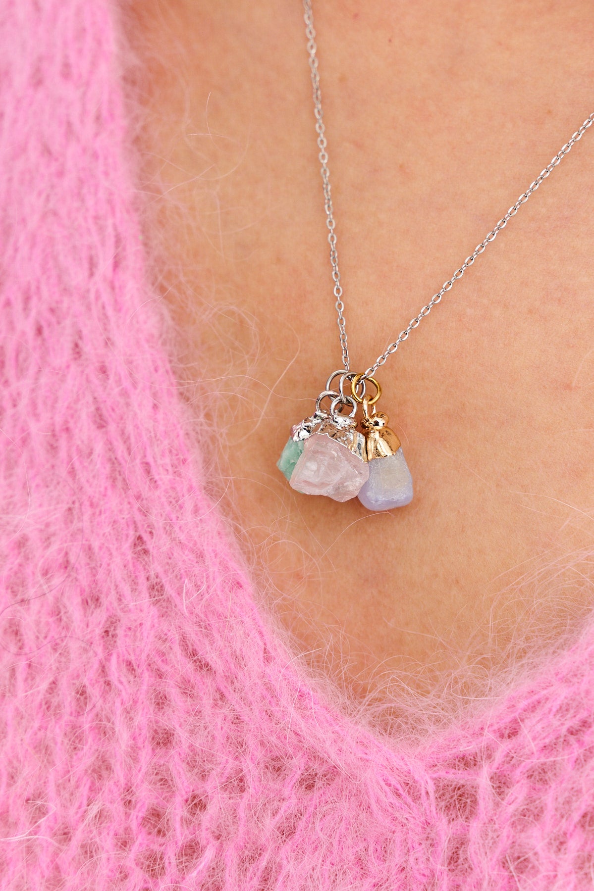 Naszyjnik Soul Stones Mystic w srebrnym kolorze to subtelny talizman, który łączy moc trzech kamieni: kwarcu różowego, surowego szmaragdu i błękitnego agatu. Idealny dla kobiet szukających wewnętrznego spokoju, równowagi i autentycznego piękna.
