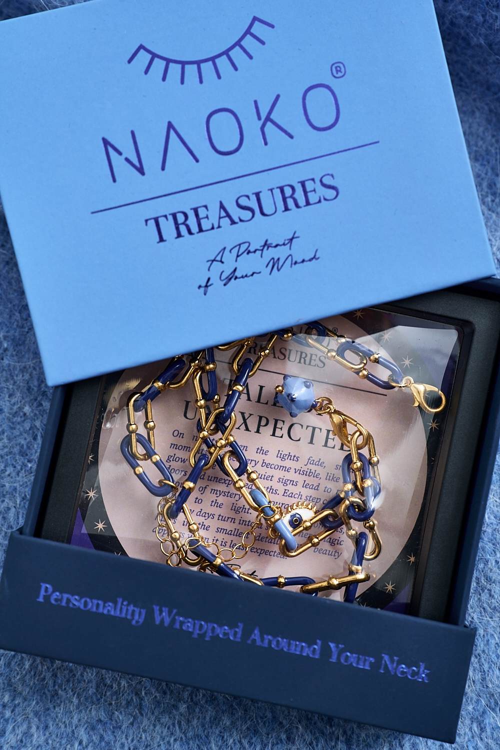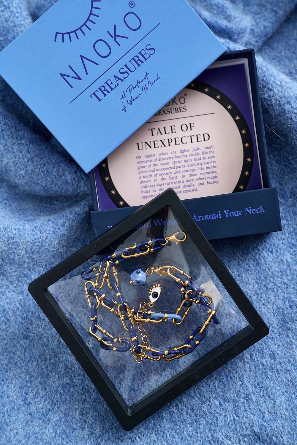 Naszyjnik Wonderland to biżuteria, która łamie schematy. Klasyczny łańcuch o dużych ogniwach zyskał nowe życie dzięki zastosowaniu granatowej emalii, przeplatanej elementami w kolorze szczotkowanego złota. Całość dopełniają unikalne zawieszki, w tym motyw oka, nadając naszyjnikowi tajemniczego charakteru.