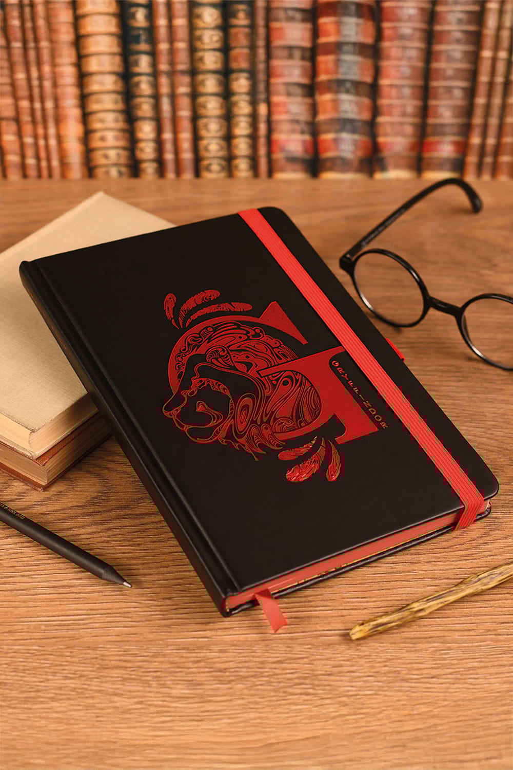 Notes Gryffindor to dumny symbol przynależności do domu Lwa, stworzony dla tych, którzy cenią męstwo i odwagę. Elegancka, głęboka czerń okładki stanowi doskonałe tło dla imponującego, metalicznego emblematu lwa splecionego z literą „G”, wykonanego w lśniącej, karmazynowej folii. Unikalny charakter tego notesu podkreślają brzegi kartek barwione na intensywny czerwony kolor, tworzące niesamowity efekt wizualny przy zamkniętym bloku.