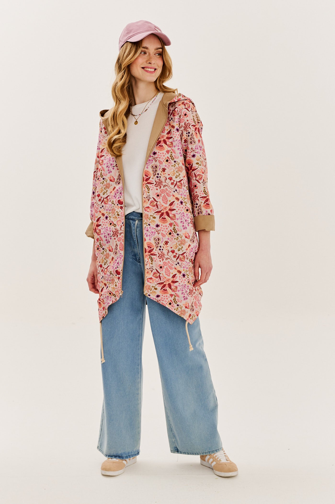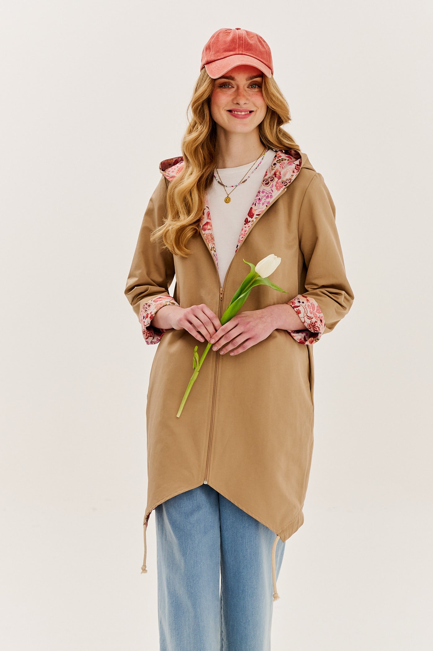 Parka dwustronna Golden Meadow to połączenie komfortu i stylu. Jej wyjątkowy design łączy ponadczasowy kolor beżowy z energetycznym kwiatowym wzorem, tworząc niepowtarzalny efekt. Oversizowy krój nadaje jej modny, casualowy charakter, a kaptur i funkcjonalne kieszenie podkreślają jej unikalny styl.