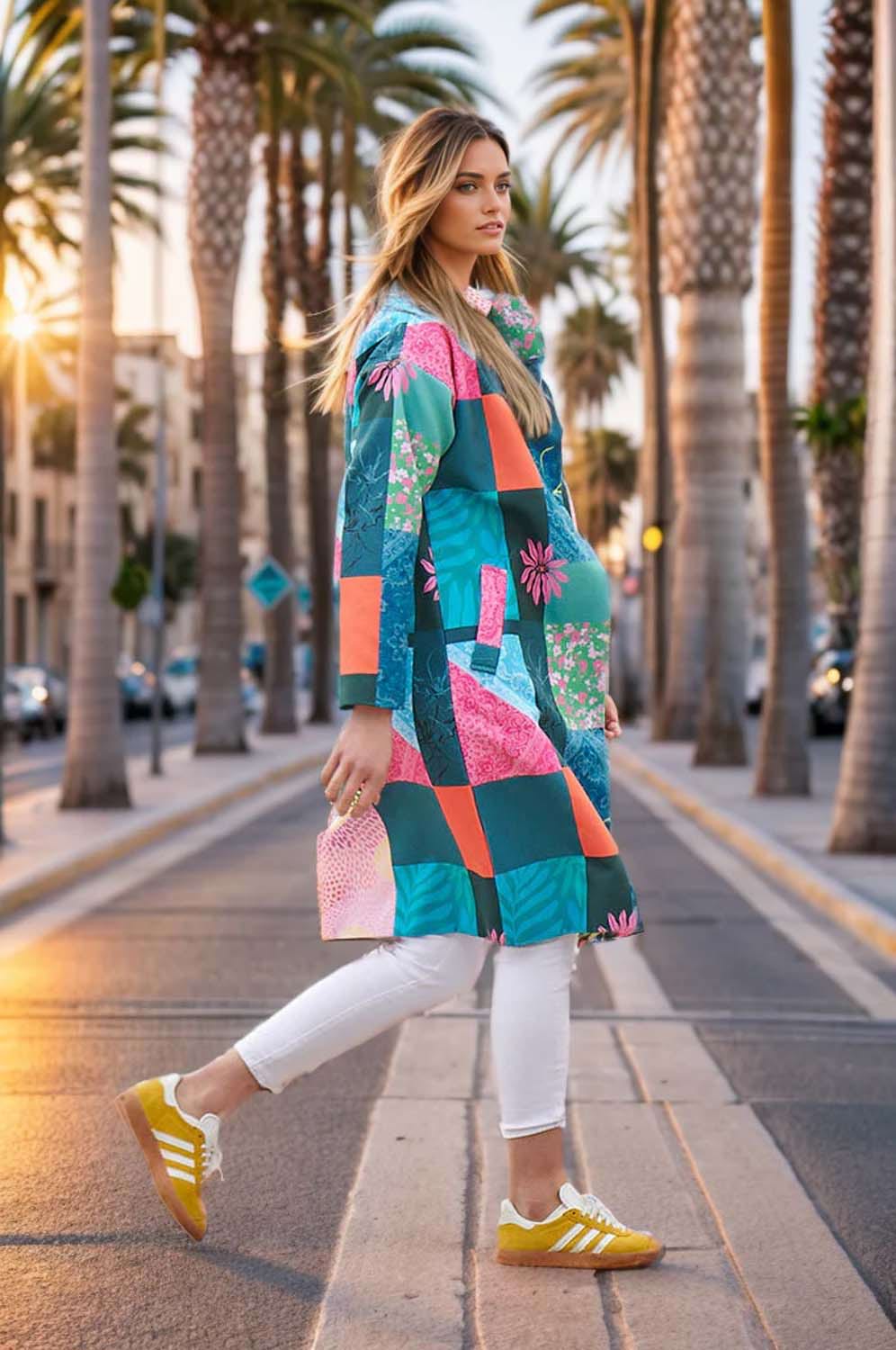 Garden Of Magic łączy w sobie najpiękniejsze kolory, które subtelnie ze sobą kontrastując, tworzą przepiękną feerię barw. Turkusowy, niebieski, ciemnozielony, różowy i pomarańczowy tworzą energetyczny mix, który pasuje do każdego typu kolorystycznego urody, ożywiając i rozpromieniając twarz. Ten patchworkowy płaszcz wydobywa z urody to, co najlepsze i pasuje do każdej sylwetki.