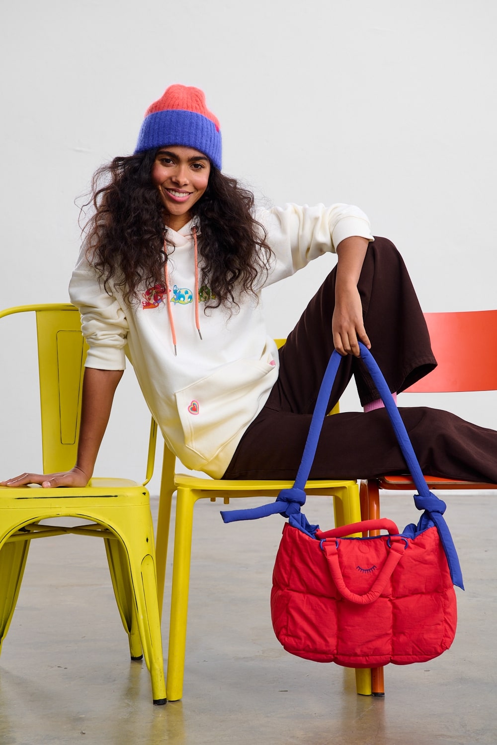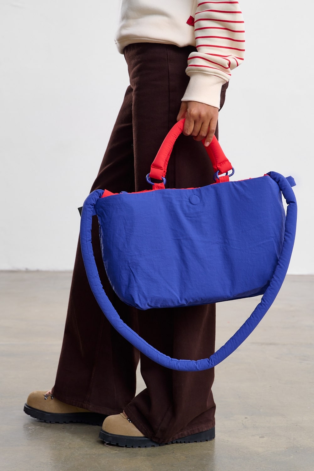 Miękka, pikowana faktura sprawia, że torba jest nie tylko stylowa, ale i niezwykle lekka. Pomieści wszystko, czego potrzebujesz w ciągu dnia. Posiada dwa komplety uchwytów – krótkie koralowe do ręki i długie fioletowe na ramię, zakończone modnymi supłami.