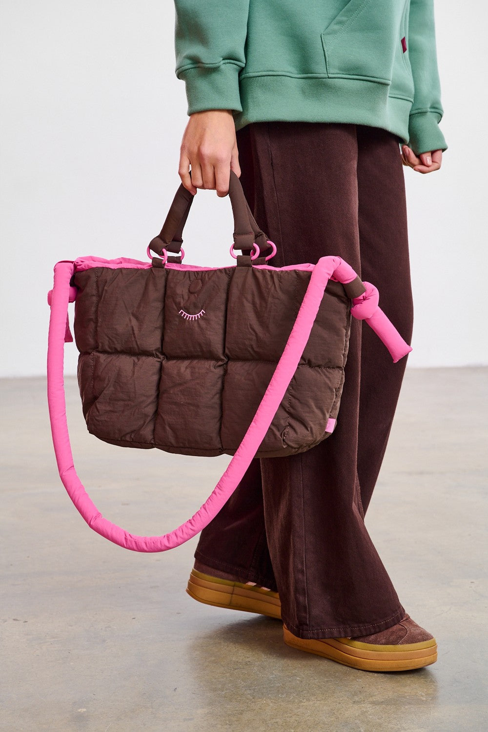 Torba jest nie tylko piękna, ale i funkcjonalna. Miękka, pikowana forma jest lekka i pojemna. Posiada dwa komplety uchwytów: krótkie, brązowe do ręki oraz długie, różowe na ramię, z ozdobnymi wiązaniami. To dodatek, który dopasuje się do Ciebie.