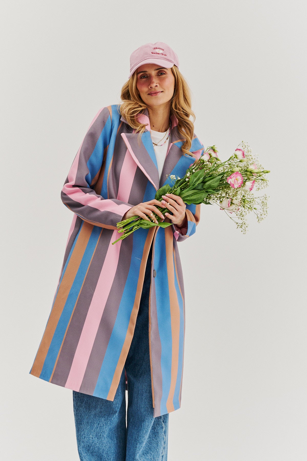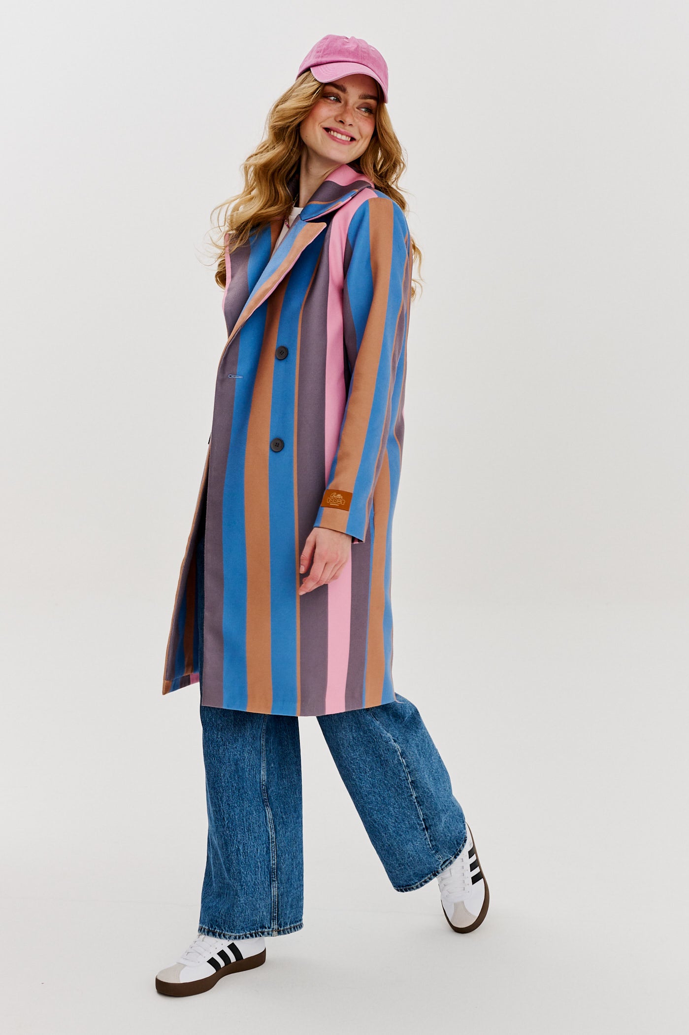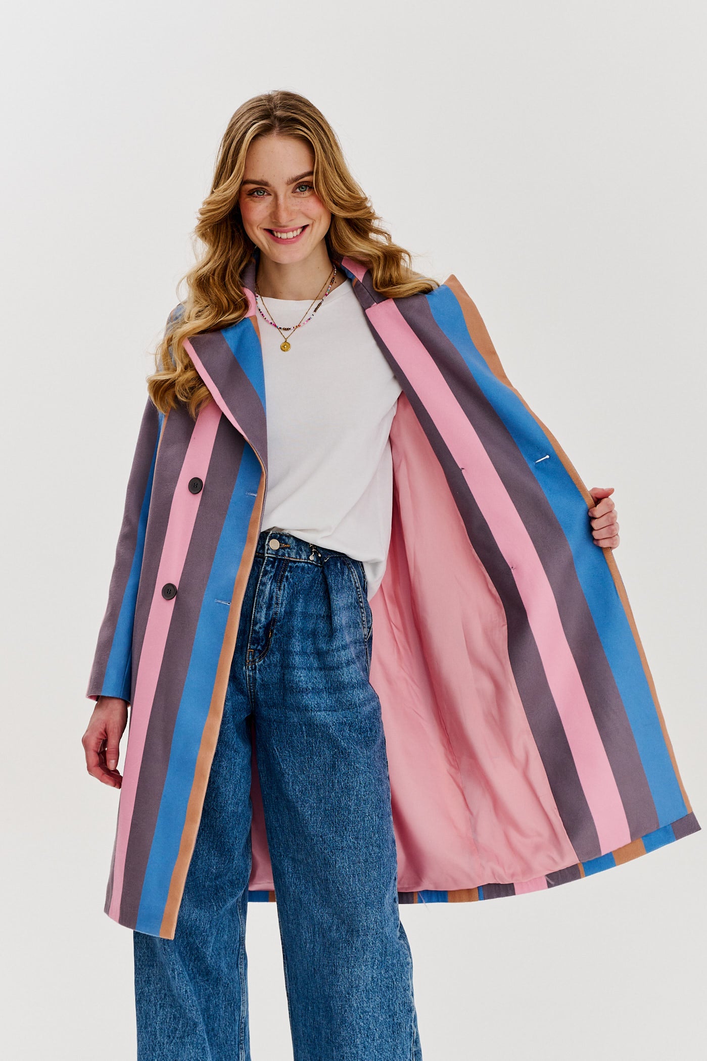 Płaszcz dwurzędowy One Step Ahead to propozycja dla kobiet, która kochają wyróżniać się na tle szarości dnia codziennego. Jego dwurzędowy krój nadaje elegancji i ponadczasowego charakteru, a pionowe pasy w pastelowych odcieniach różu, błękitu, karmelu i szarości optycznie wysmuklają sylwetkę.
