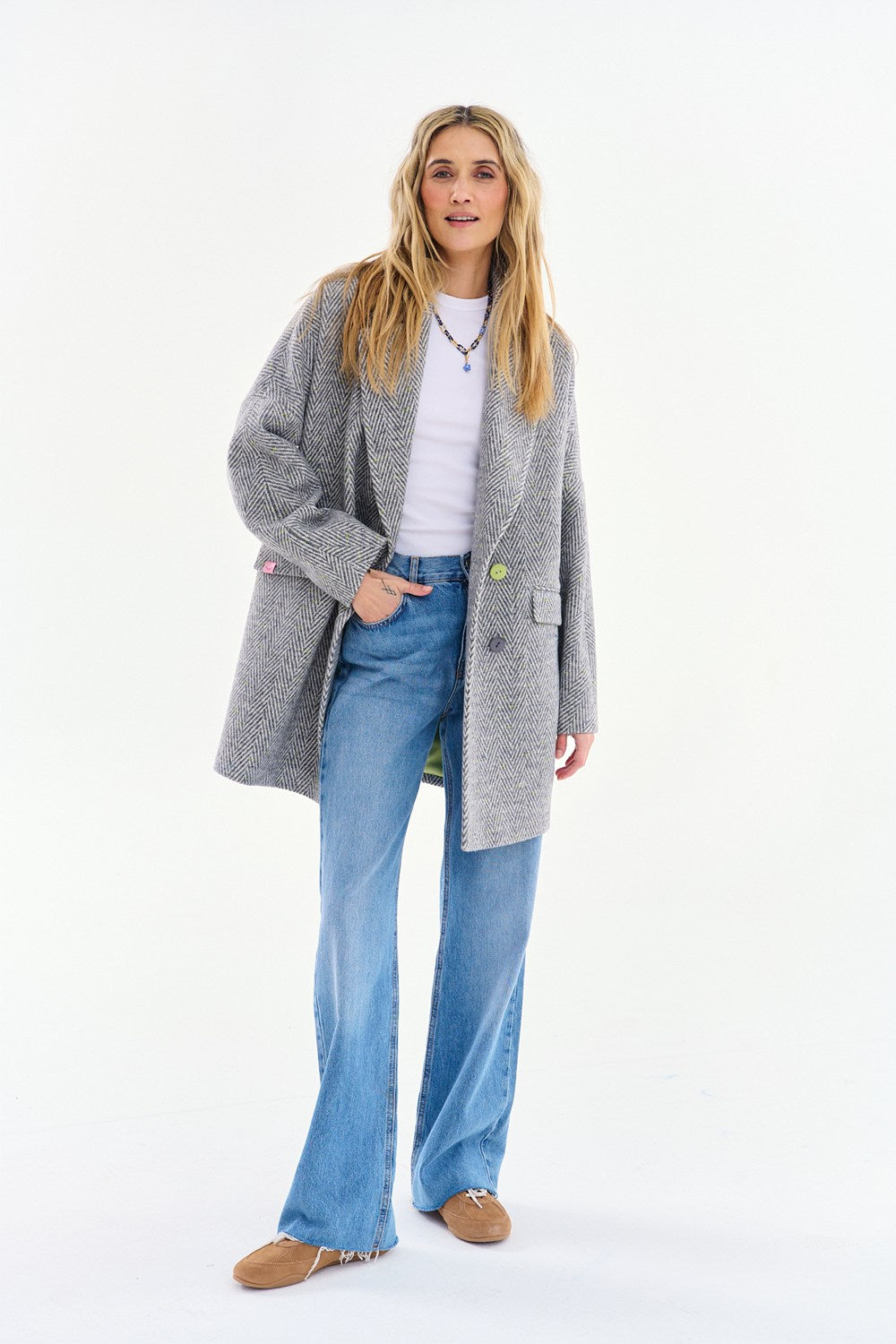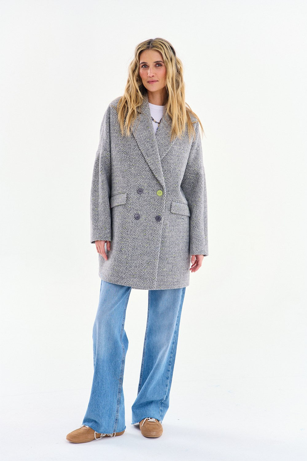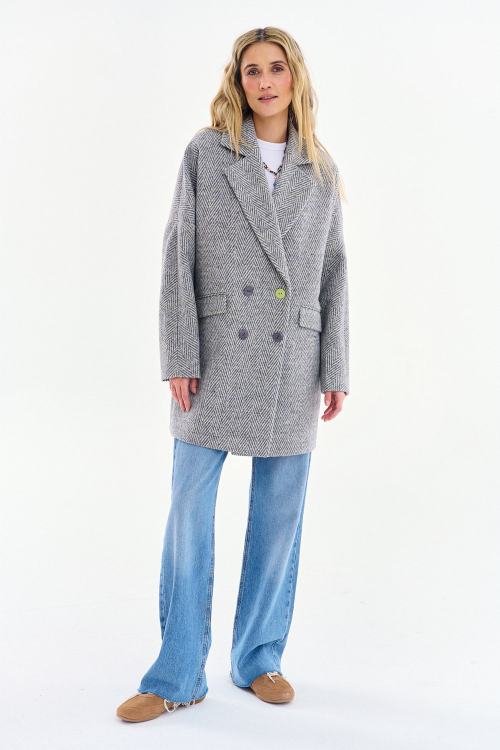 Płaszcz Minted Shadows to propozycja dla fanek minimalistycznego oversize'u. Teksturowany materiał w jodełkę nadaje mu głębi, a luźny krój zapewnia maksymalną wygodę.