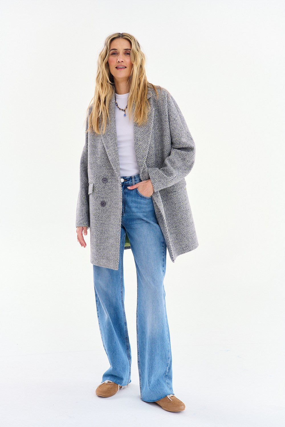 Płaszcz Minted Shadows to propozycja dla fanek minimalistycznego oversize'u. Teksturowany materiał w jodełkę nadaje mu głębi, a luźny krój zapewnia maksymalną wygodę.