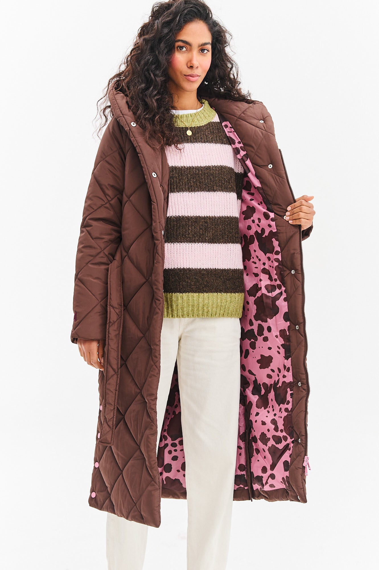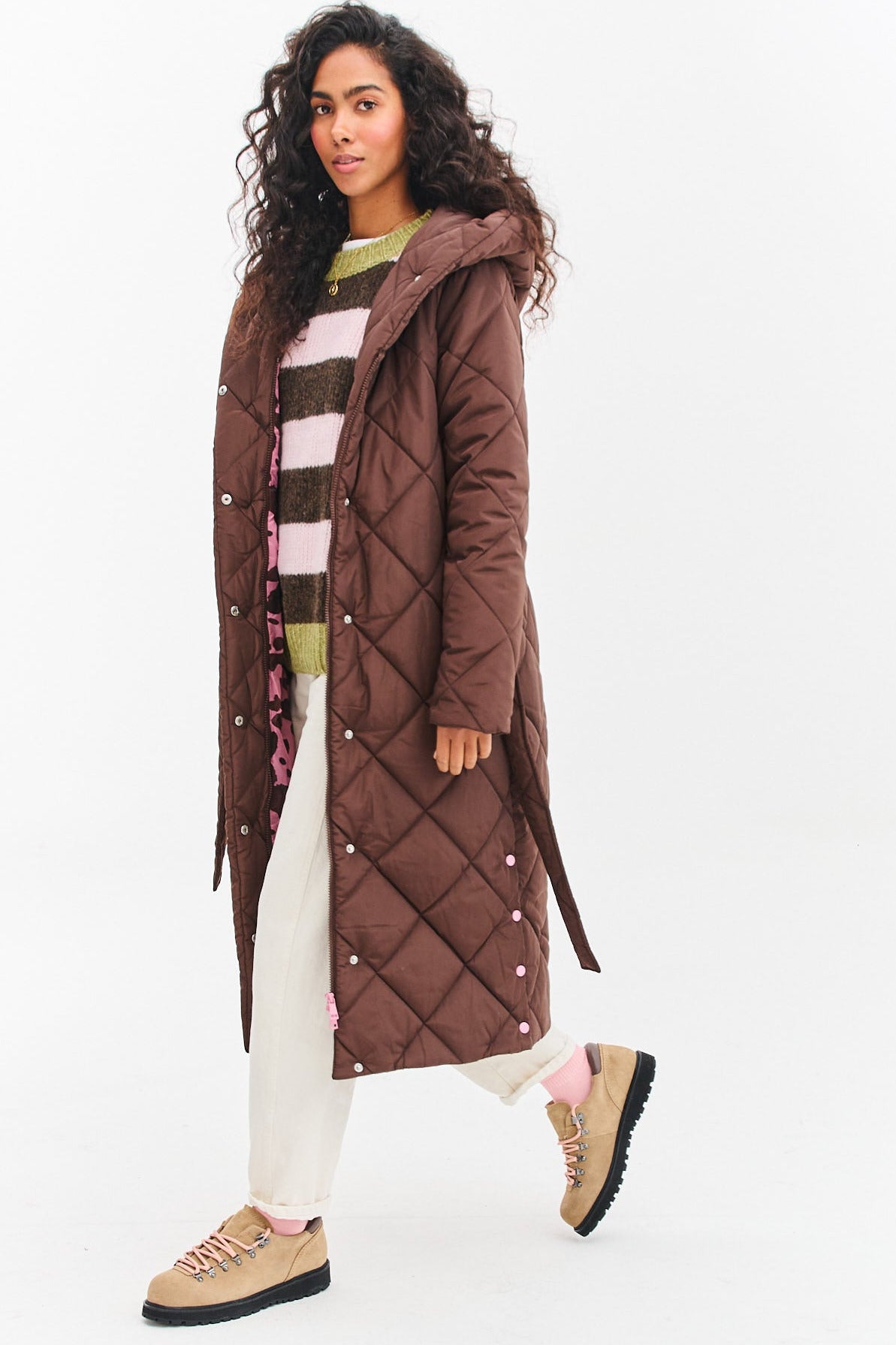 Płaszcz pikowany Anabelle Raven łączy w sobie królewski fason z codzienną funkcjonalnością. Długi krój i ciepłe, pikowane wypełnienie zapewniają komfort w chłodne dni. Duży kaptur otula i chroni, a pasek pozwala na idealne dopasowanie do sylwetki. Wewnątrz kryje się podszewka w kontrastowy wzór.