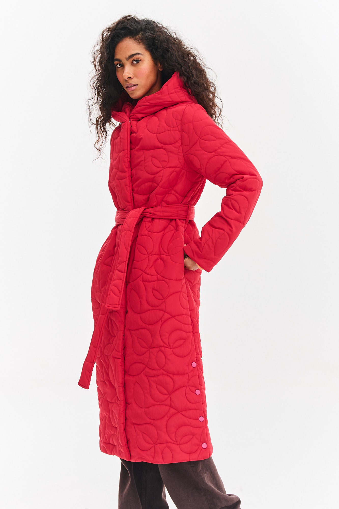 Płaszcz pikowany Anabelle Vintage Roses to synonim klasy i wygody. Jego unikalne, delikatne pikowanie w kształcie róż nadaje mu subtelnego uroku, a wiązanie w pasie pięknie podkreśla talię. Kontrastowa, wzorzysta podszewka w kapturze to detal, który zachwyca przy bliższym poznaniu.