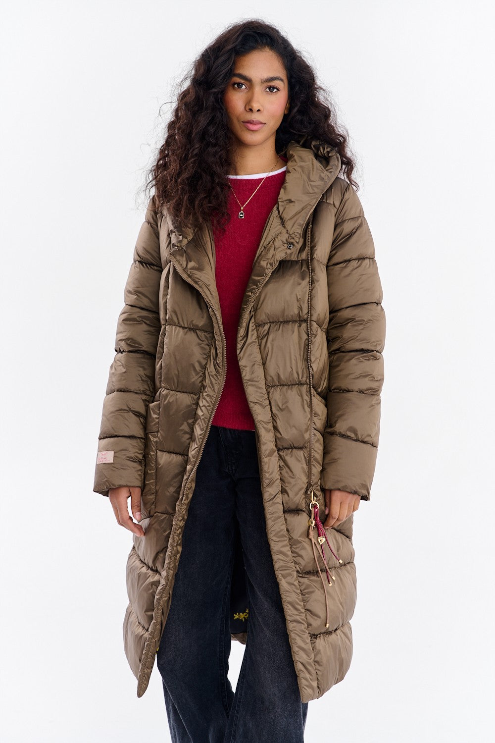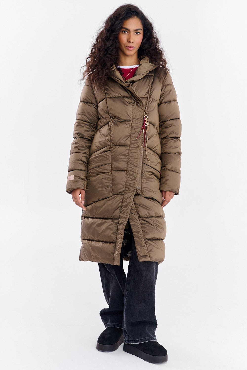 Płaszcz pikowany Arcticum Cocoa to esencja zimowej elegancji. Długi fason z obszernym kapturem i asymetrycznym zapięciem skutecznie chroni przed chłodem i wiatrem. Lekko połyskujący materiał nadaje mu szykownego charakteru, dzięki czemu płaszcz świetnie sprawdza się w wielu sytuacjach.