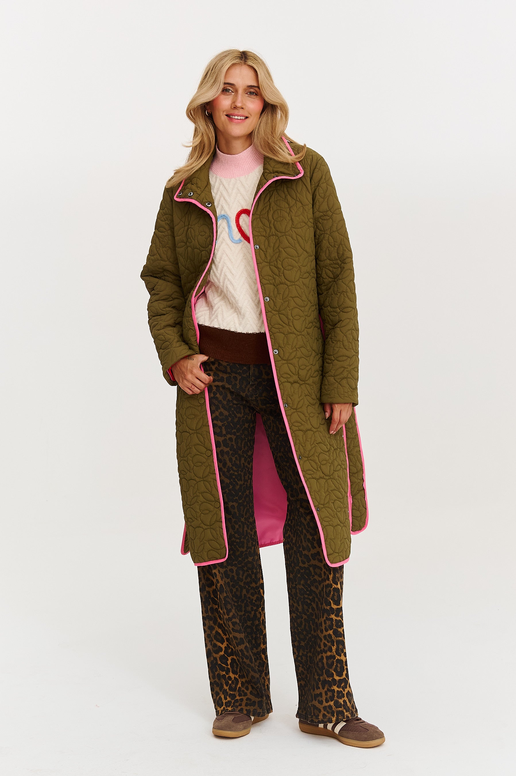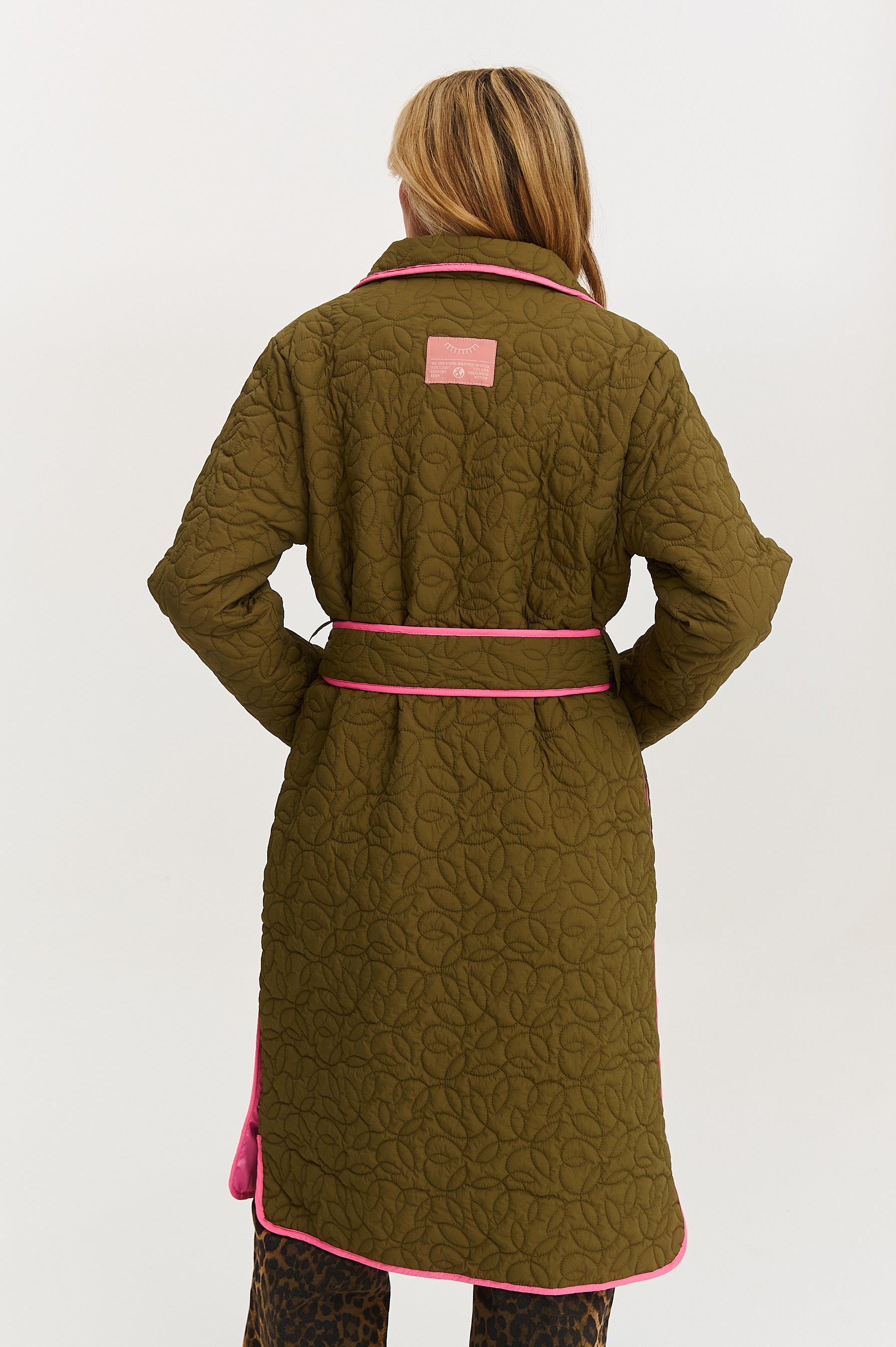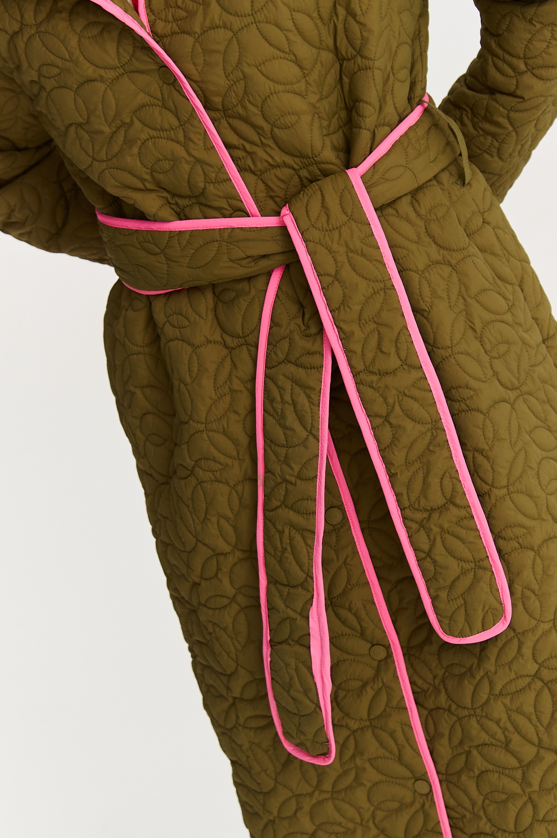 Płaszcz pikowany Wild Poem to definicja nowoczesnej elegancji. Jego prosty, wydłużony krój pięknie prezentuje się na sylwetce, a dyskretne pikowanie w kształcie liści dodaje mu artystycznego sznytu. Energetyczny, różowy kolor lamówki i paska to odważny akcent, który ożywia stonowaną zieleń.