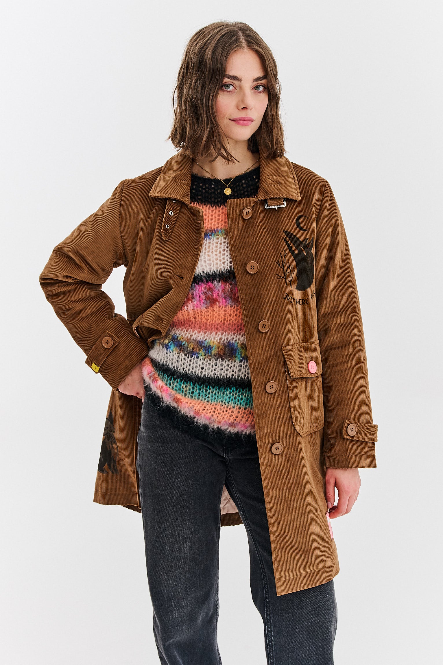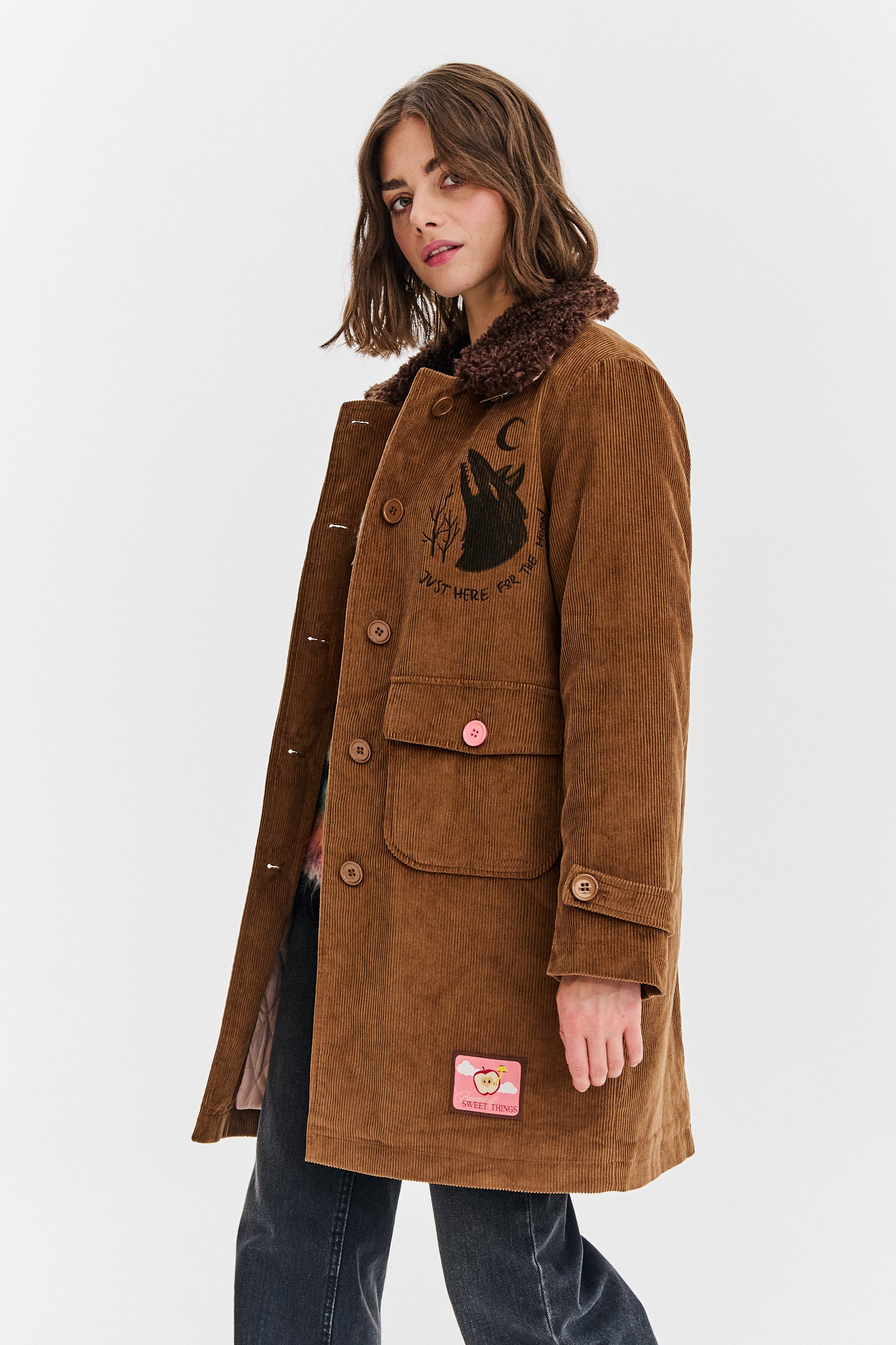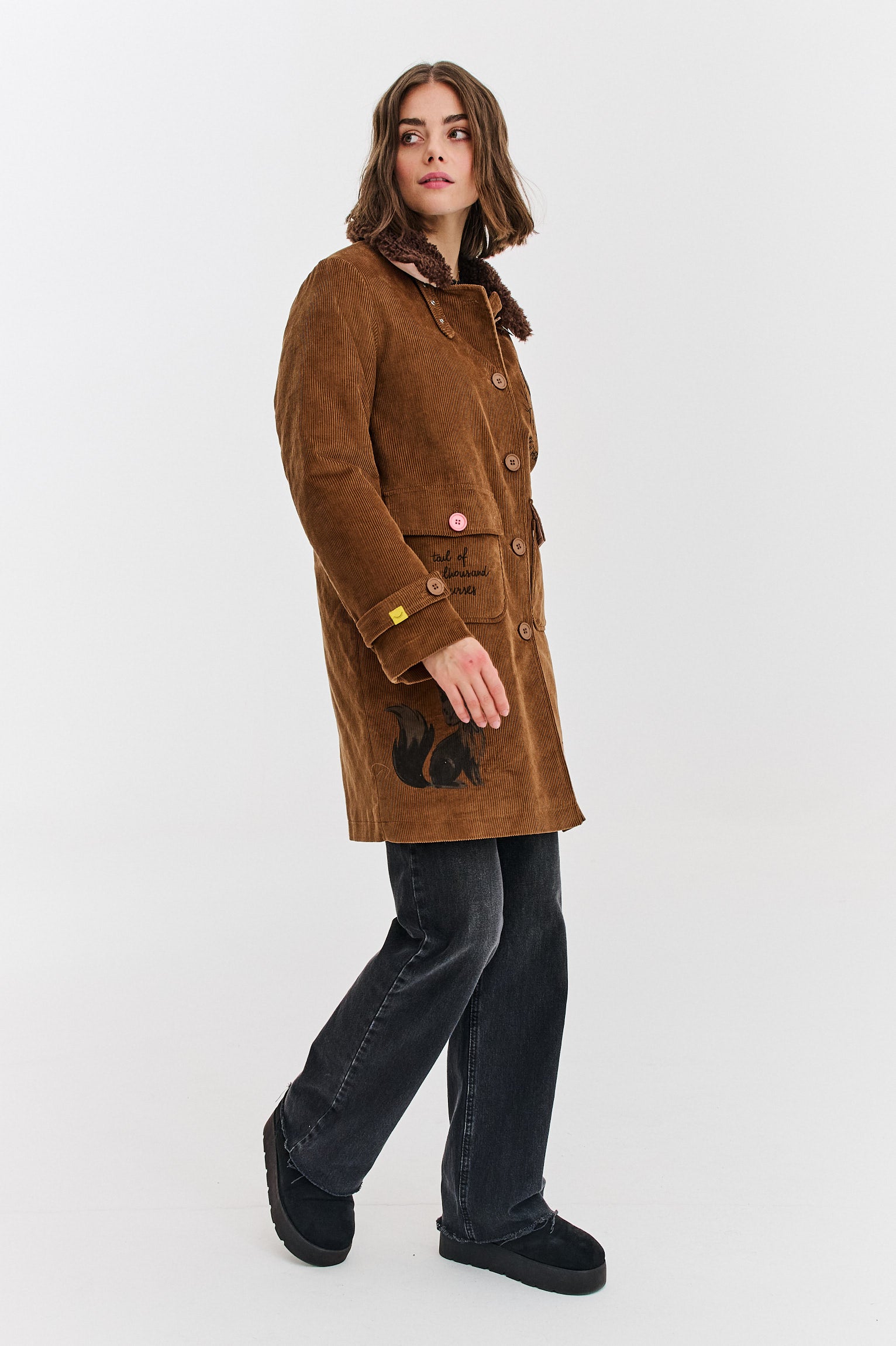 Płaszcz sztruksowy Change Your Fate to więcej niż ubranie – to płótno dla wyobraźni. Każdy detal, od futrzanego kołnierza po naszywki z lisem i wilkiem, tworzy spójną, leśną opowieść. Klasyczny, prosty krój płaszcza sprawia, że jest on nie tylko piękny, ale też niezwykle wygodny.
