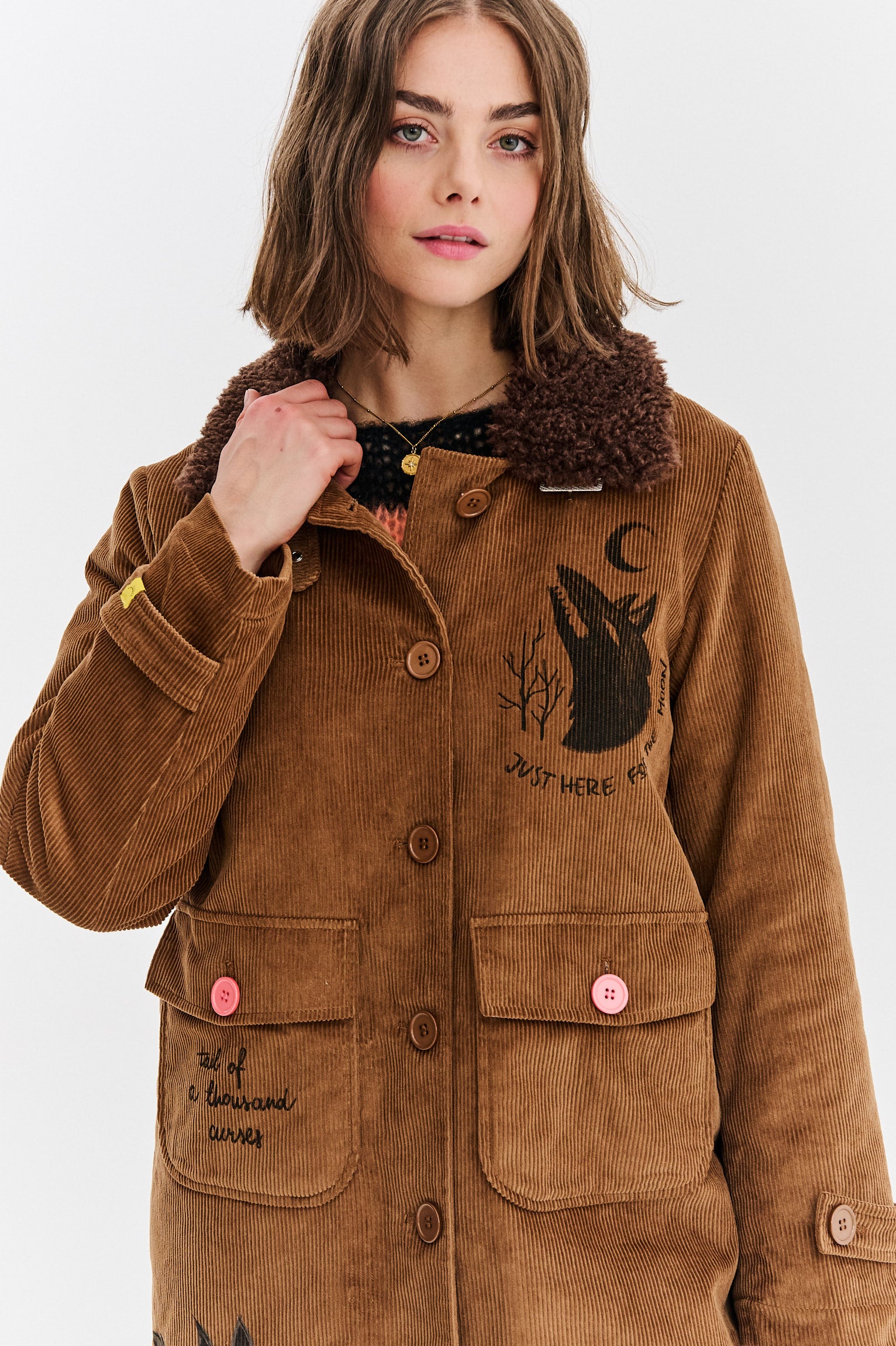 Płaszcz sztruksowy Change Your Fate to więcej niż ubranie – to płótno dla wyobraźni. Każdy detal, od futrzanego kołnierza po naszywki z lisem i wilkiem, tworzy spójną, leśną opowieść. Klasyczny, prosty krój płaszcza sprawia, że jest on nie tylko piękny, ale też niezwykle wygodny.