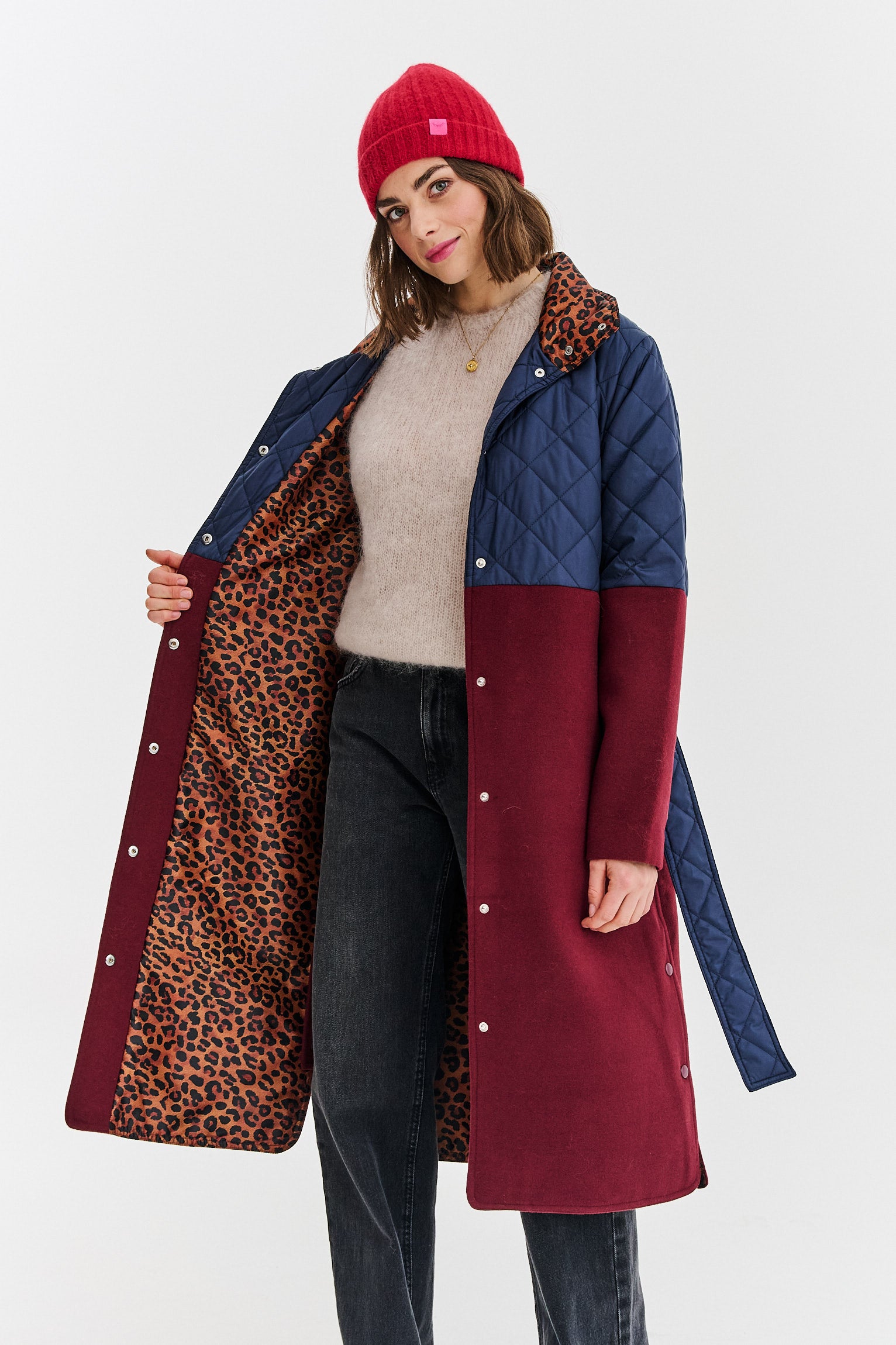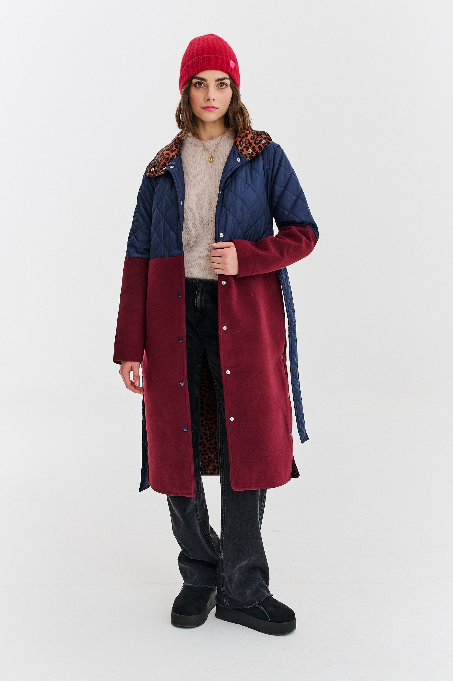 Płaszcz z łączonych tkanin Deep Silence to nowoczesna interpretacja klasycznego trencza. Połączenie dwóch różnych materiałów i kolorów nadaje mu wyjątkowego charakteru. Pikowana góra zapewnia ciepło, a prosty dół dodaje elegancji. To idealny płaszcz przejściowy i na łagodniejszą zimę.