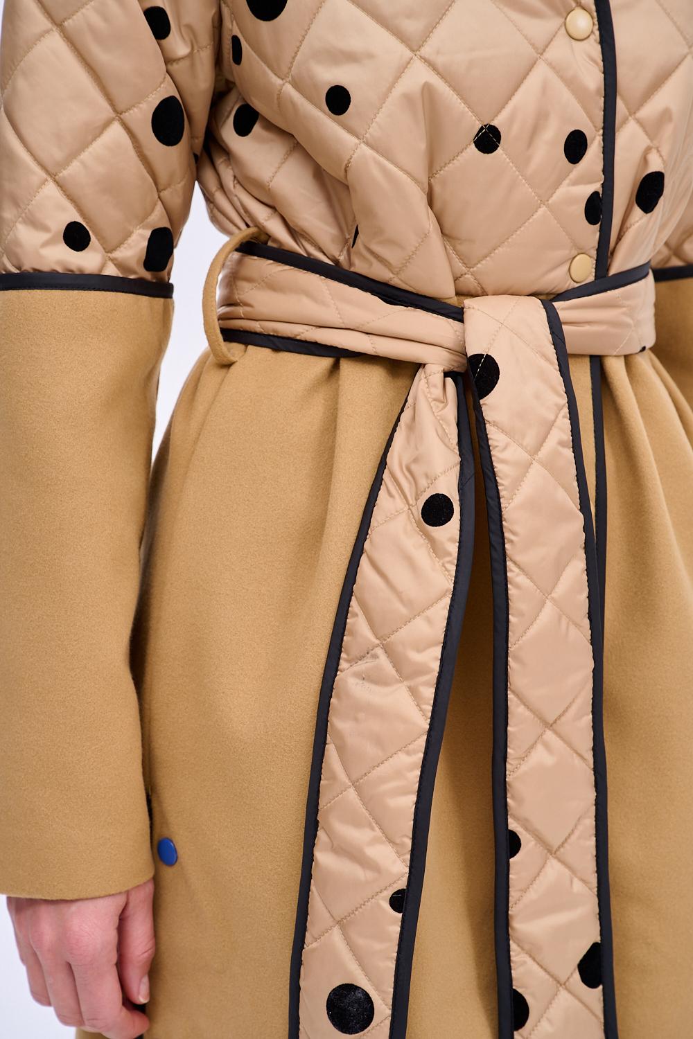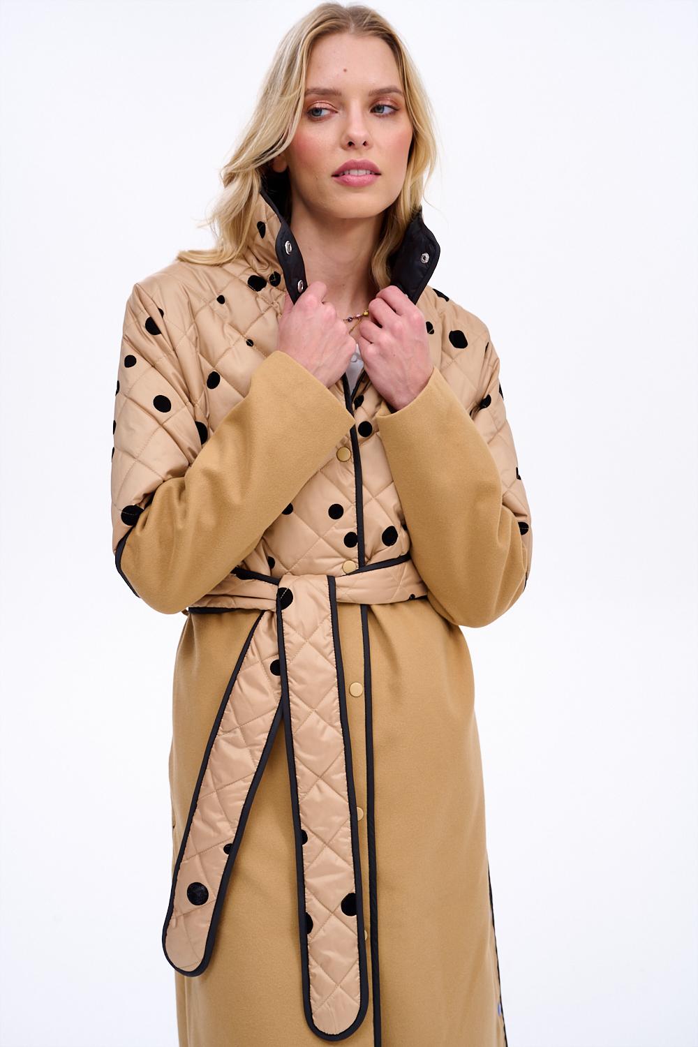 Płaszcz z łączonych tkanin Pinpoint to wyjątkowe połączenie dwóch światów: klasycznego beżu i nowoczesnego designu. Góra modelu wykonana została z pikowanego materiału ozdobionego delikatnym geometrycznym wzorem oraz nadrukiem przypominającym tuszowe plamki – jakby ktoś zaznaczył na mapie momenty warte zapamiętania. Dolna część płaszcza utrzymana jest w gładkiej tonacji, co daje ciekawy kontrast i podkreśla nowoczesny krój.