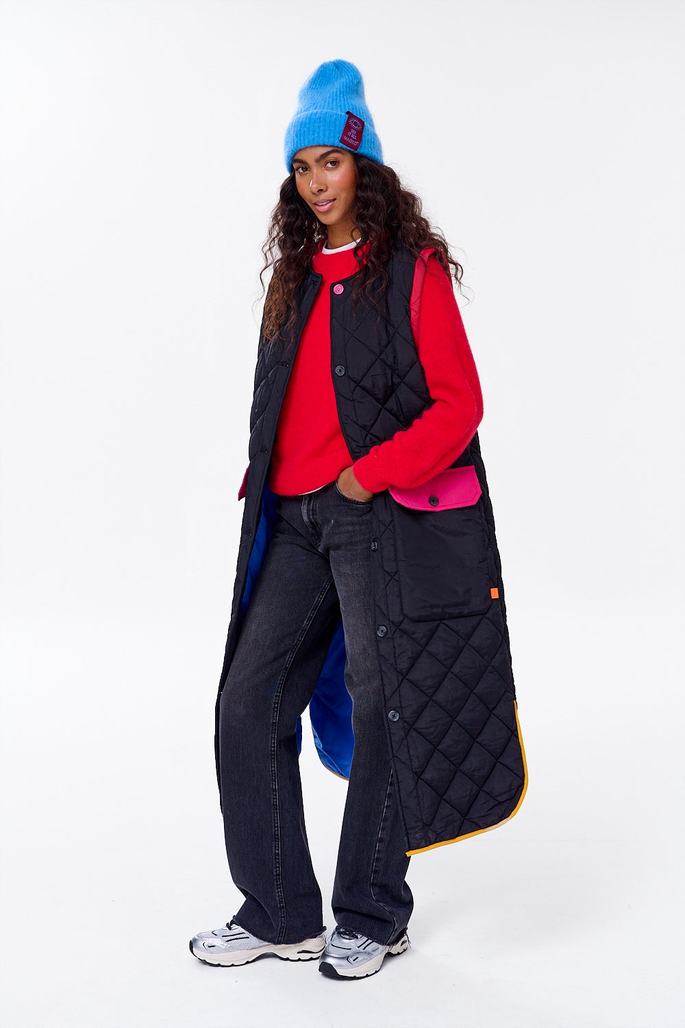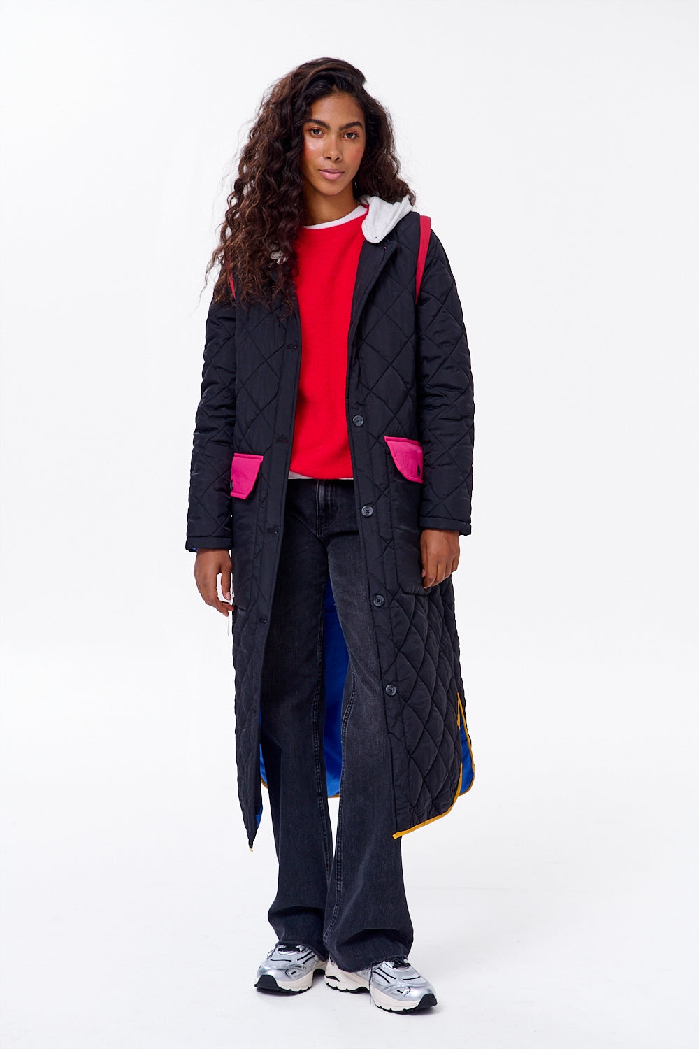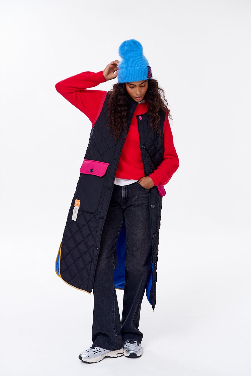 Płaszcz z odpinanymi rękawami Street Beat to propozycja, która łączy miejski vibe z funkcjonalnością. Pikowany fason w głębokim odcieniu czerni przełamany został kolorowymi detalami – kontrastowymi lamówkami, kieszeniami z fioletowymi klapami i sportowym kapturem. Dzięki odpinanym rękawom możesz w jednej chwili zmienić go w praktyczną, dłuższą kamizelkę – idealną do stylizacji warstwowych.