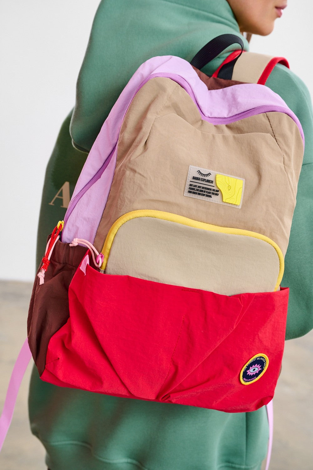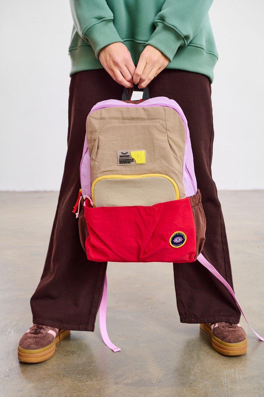 Plecak Vivid Vibes to zabawa kolorami w praktycznym wydaniu. Model bazuje na odcieniach beżu i brązu, które zostały dynamicznie przełamane przez dużą, czerwoną kieszeń z przodu oraz fioletowe akcenty na szelkach i przy zamkach.