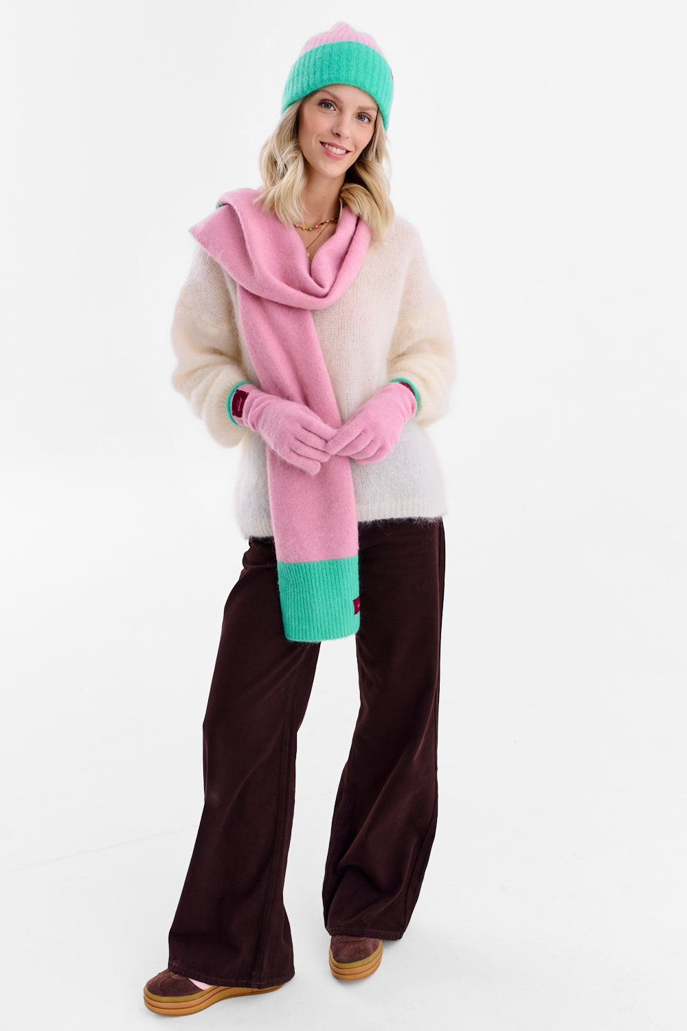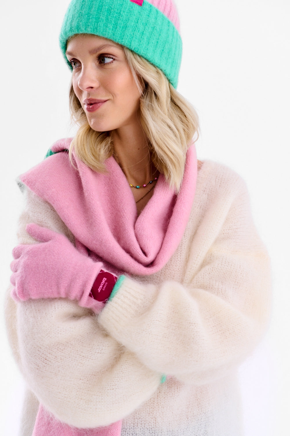 Rękawiczki DuoPuff Juicy Matcha to prosty design z kolorystycznym twistem. Rękawiczki są wykonane z gładkiej dzianiny w odcieniu różu, a całość wieńczy szeroki, prążkowany ściągacz w kontrastowym kolorze zieleni.