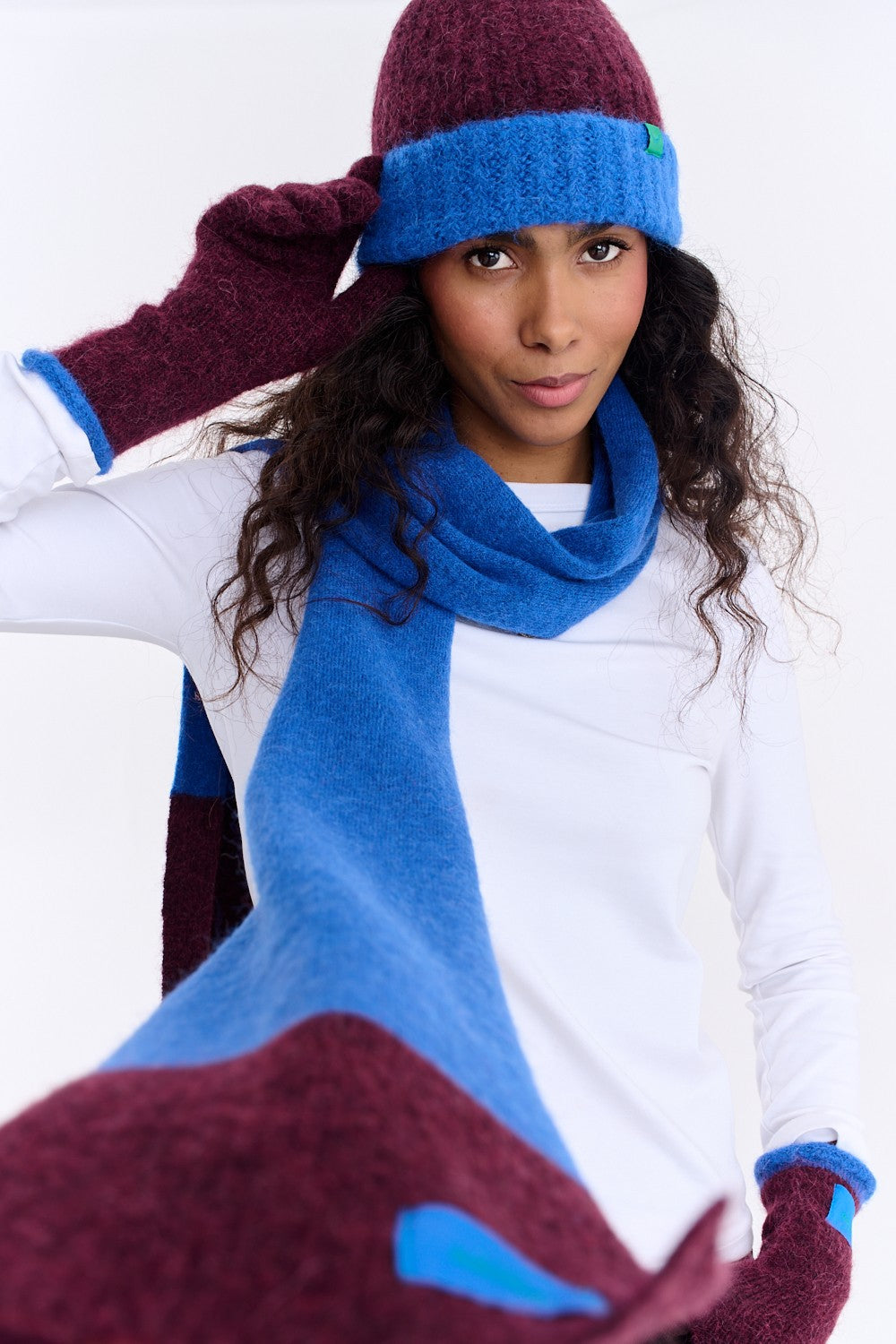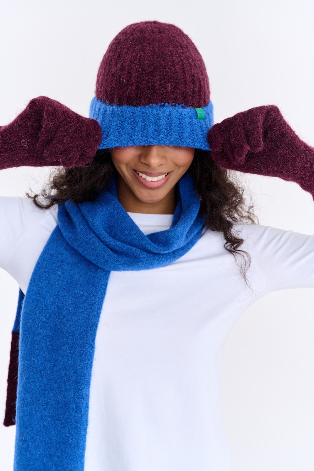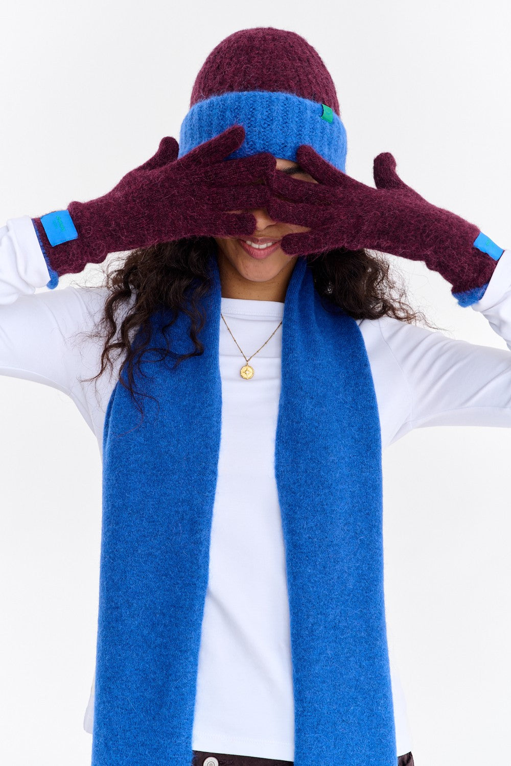 Rękawiczki DuoPuff Plum Ocean to mocny akcent kolorystyczny na Twoich dłoniach. Model to odwrócenie kolorów z czapki i szalika – tutaj dominuje śliwkowy brąz, a prążkowany mankiet ma kolor głębokiego oceanu. To świetny sposób na uzupełnienie zestawu.