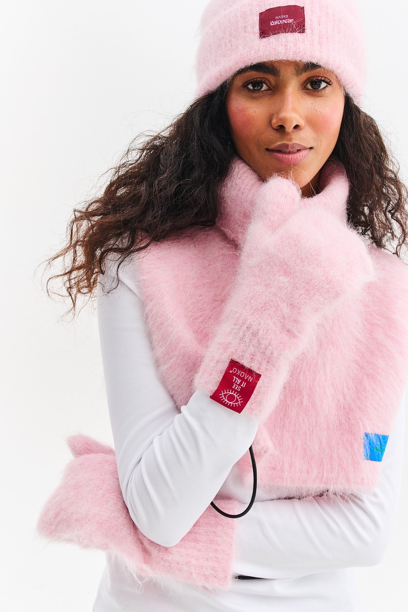 Delikatny, różowy kolor "Blush" pięknie komponuje się z wieloma odcieniami płaszczy – od szarości, przez beże, po granat. To idealne dopełnienie zimowego looku, zwłaszcza w połączeniu z czapką i kominem z tej samej, puszystej dzianiny.