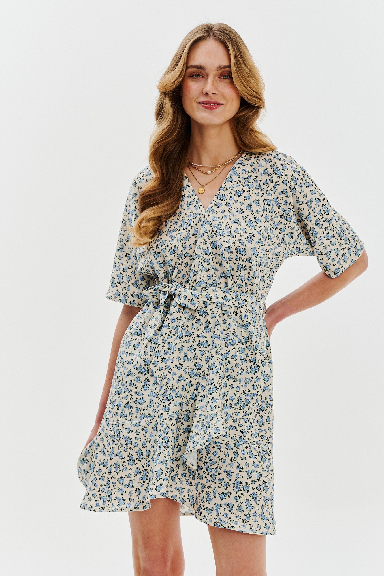 Kopertowy dekolt i taliowany fason podkreślają kobiecą sylwetkę, a falbana na dole dodaje jej subtelnego ruchu przy każdym kroku. Pasek w talii pozwala na indywidualne dopasowanie – niezależnie, czy idziesz na spacer po parku, czy spotkanie z przyjaciółkami.