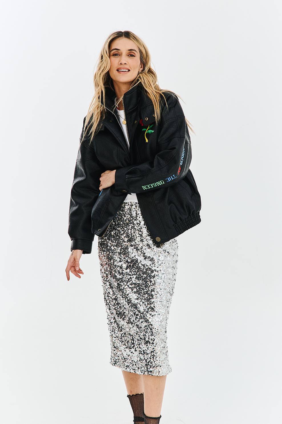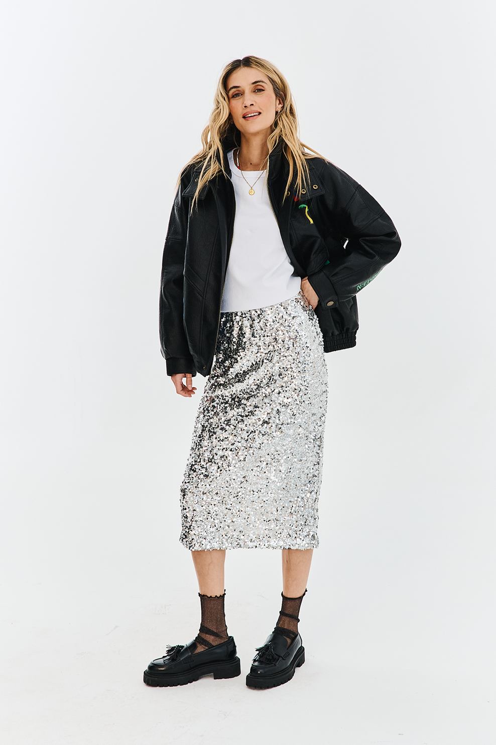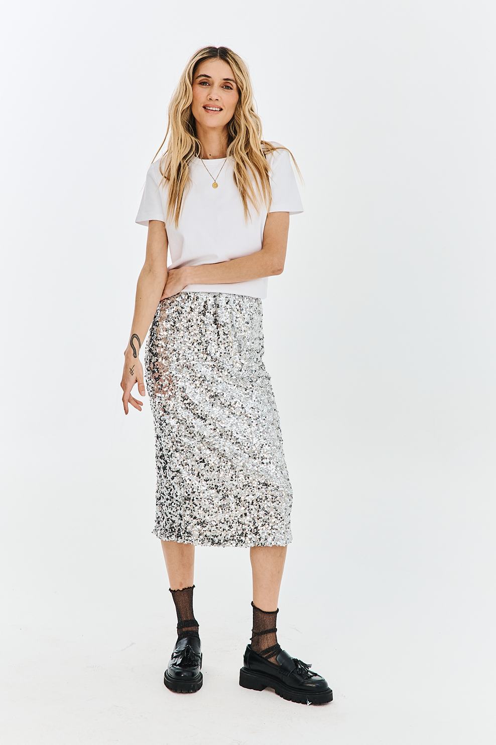 Spódnica cekinowa Sparkle Rush to elegancki wybór dla kobiet, które pragną błyszczeć podczas wyjątkowych okazji. Wyróżniający się, srebrny odcień i połyskujące cekiny nadają stylizacji luksusowego charakteru. Ołówkowy fason podkreśla sylwetkę, a elastyczny pas - gumka w pasie - zapewnia wygodę i idealne dopasowanie