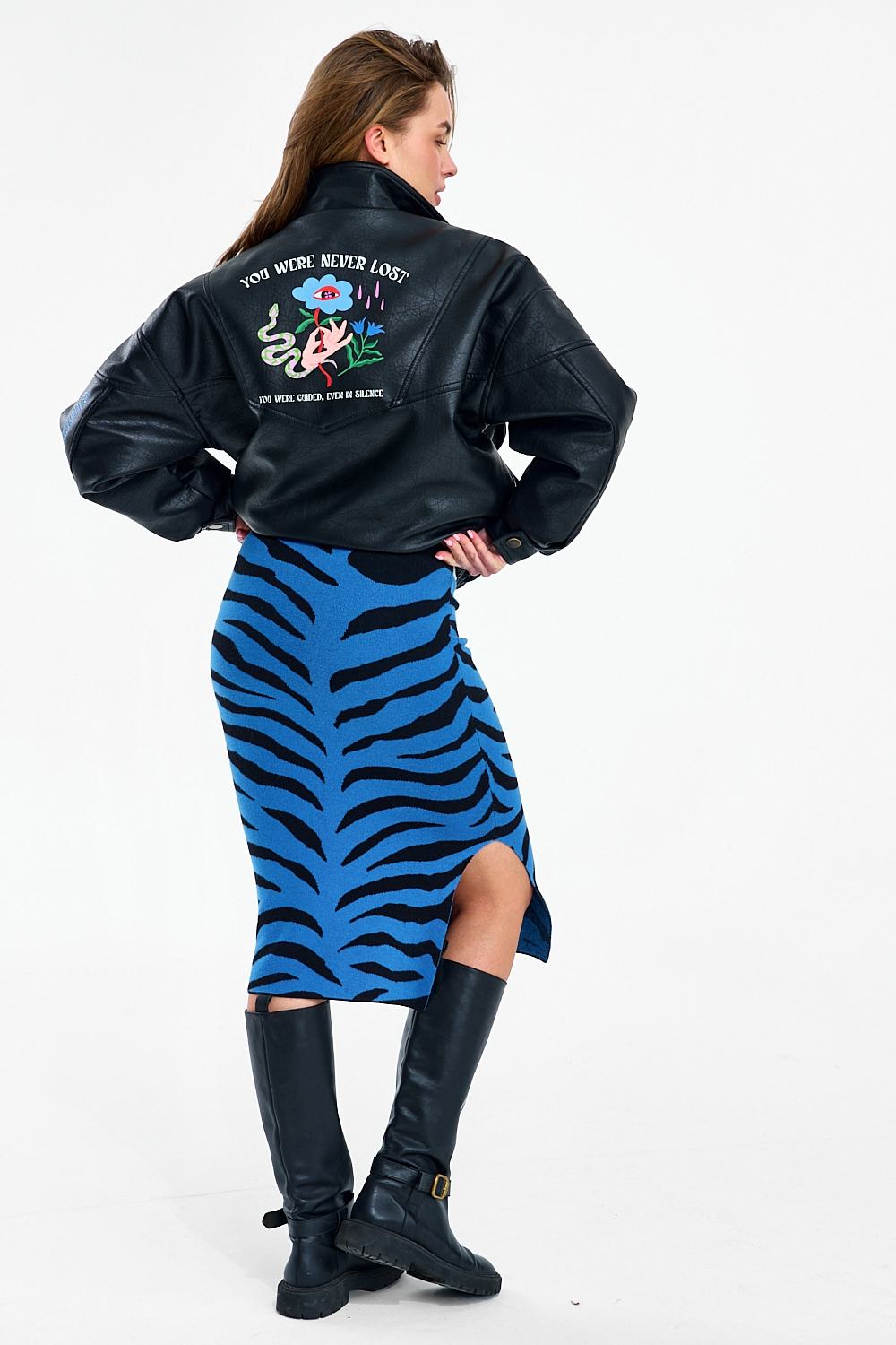 Spódnica dzianinowa Blue Rebel to propozycja dla kobiet, które nie boją się wyróżniać. Ołówkowy krój podkreśla figurę, a elastyczna dzianina zapewnia wygodę noszenia przez cały dzień. Wzór inspirowany tygrysimi pasami w odważnej kolorystyce nadaje jej rockowego charakteru.
