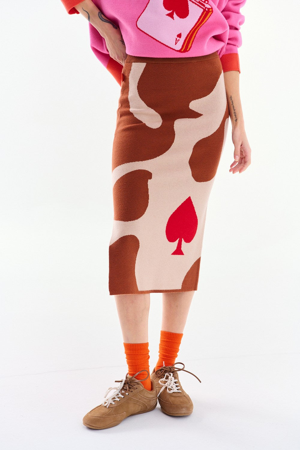 Spódnica dzianinowa Lucky Move łączy w sobie komfort i najgorętsze trendy. Brązowo-kremowy wzór inspirowany naturą został przełamany wyrazistym, czerwonym symbolem pik.