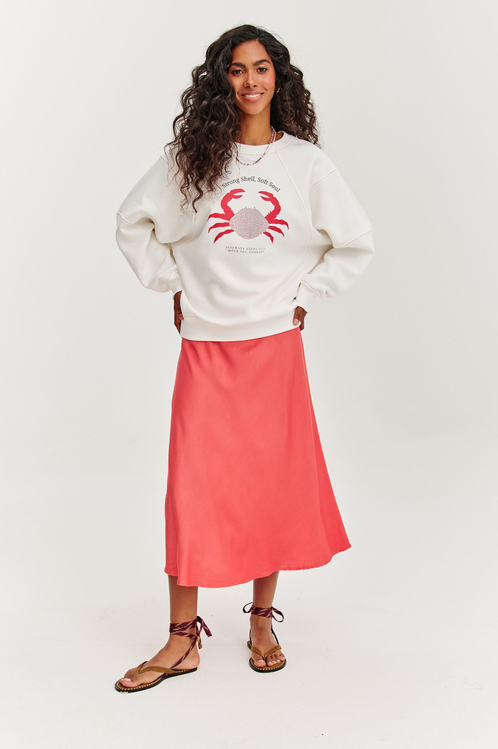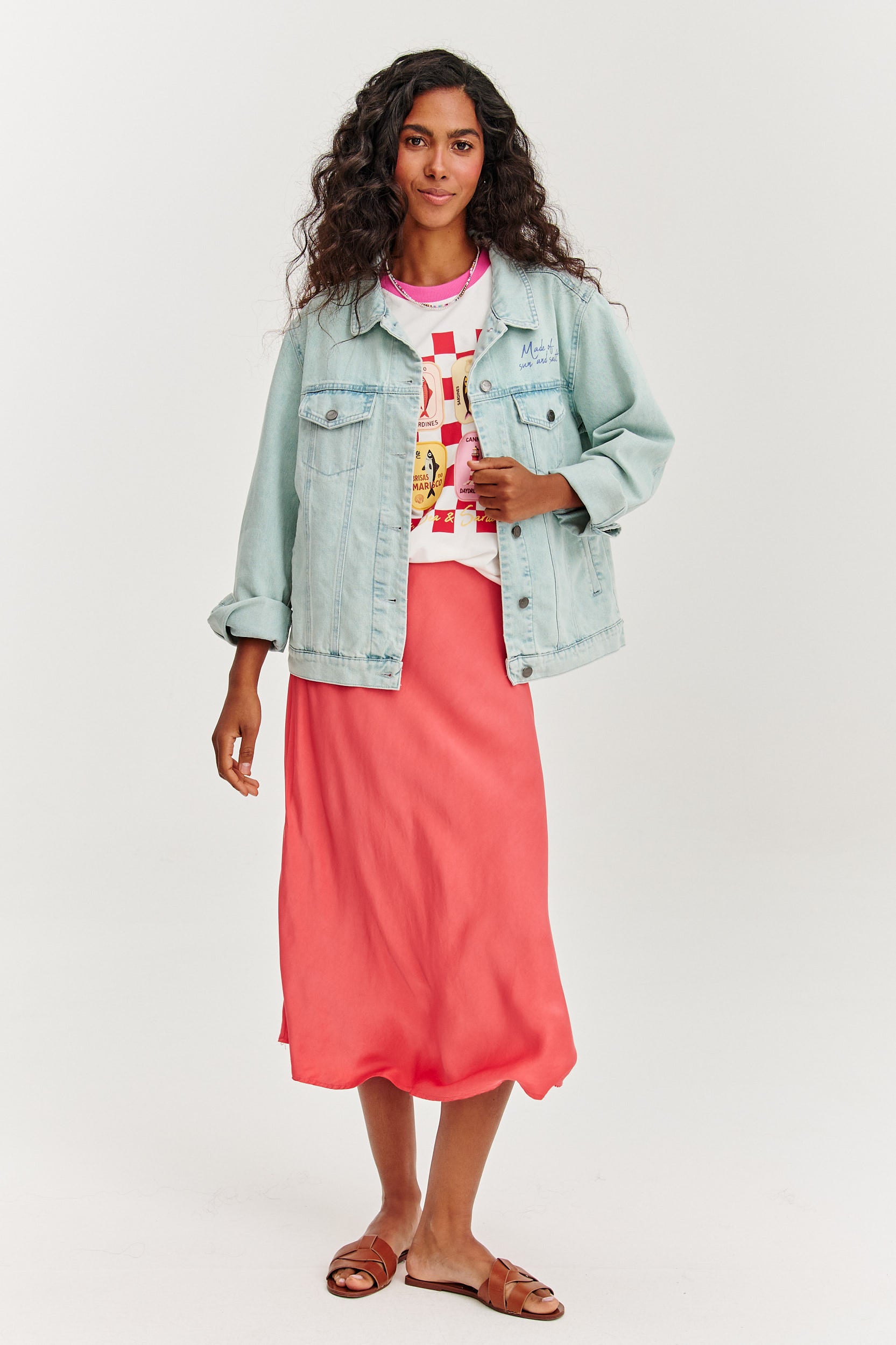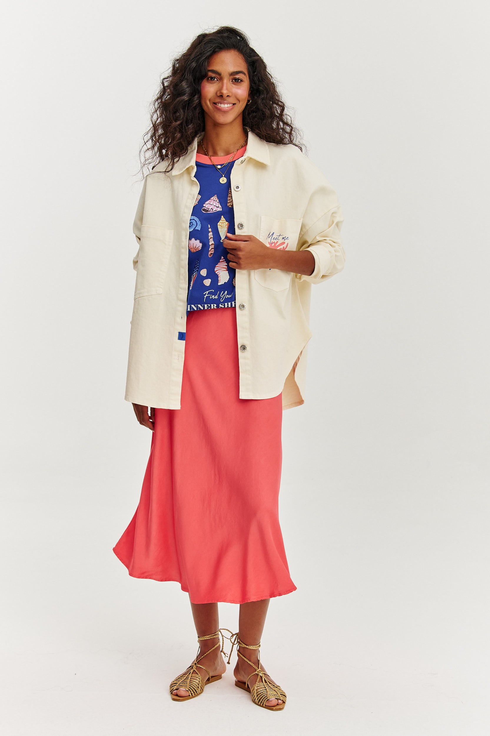 Spódnica midi Coral Sunset zachwyca soczystym, energetyzującym kolorem, który od razu przywołuje na myśl zachód słońca nad tropikalną plażą. Jej delikatnie połyskujący materiał miękko opływa sylwetkę, tworząc kobiecy, zmysłowy look.