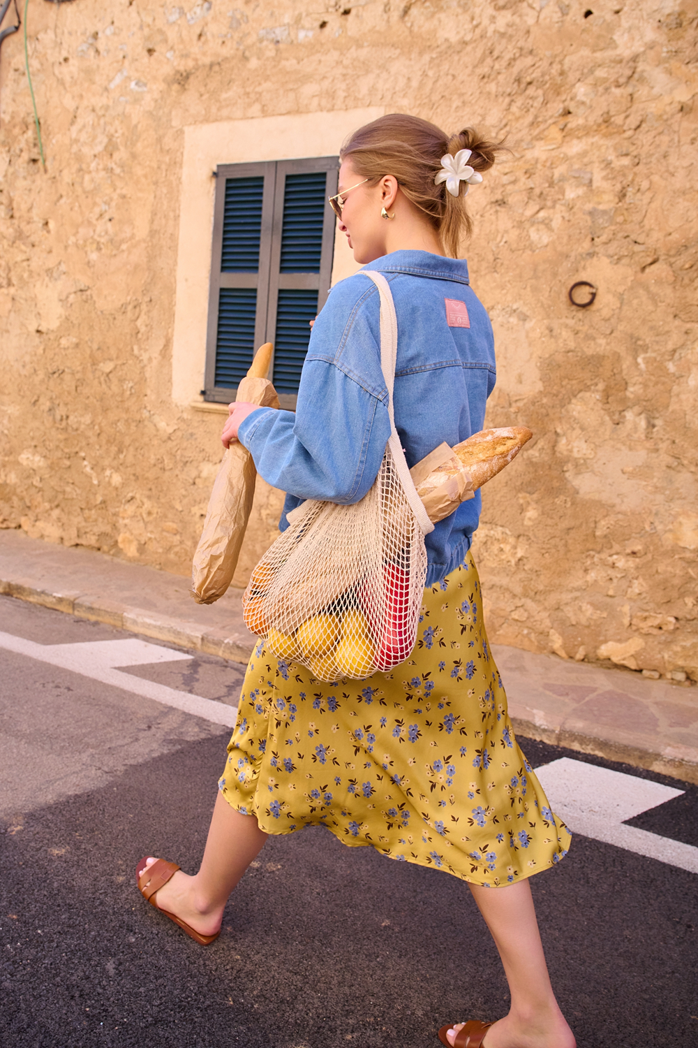 Delikatny wzór w kwiaty nie potrzebuje dodatkowych ozdobników - ta spódnica mówi sama za siebie! Połącz ją z subtelnymi kolorami - klasyczna biel lub beże. Spódnica jest idealnym wyborem zarówno na codzienne stylizacje, jak i bardziej eleganckie okazje.