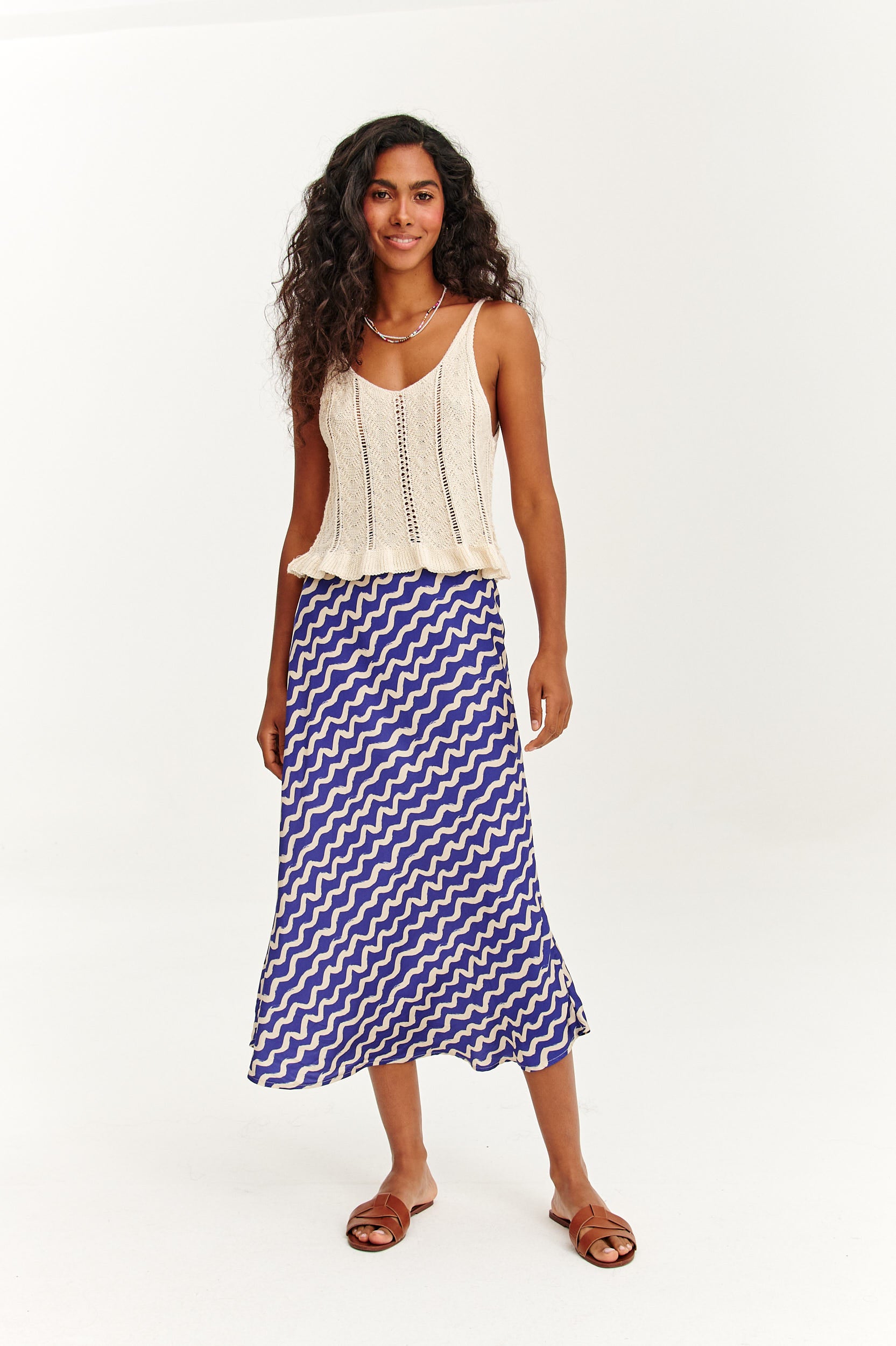 Spódnica midi Notte Mare to ukłon w stronę letnich, włoskich nocy – głęboki kobaltowy odcień i falujący wzór niczym spokojne fale Morza Śródziemnego. Model o długości midi pięknie układa się na sylwetce i dodaje stylizacji energii oraz lekkości.