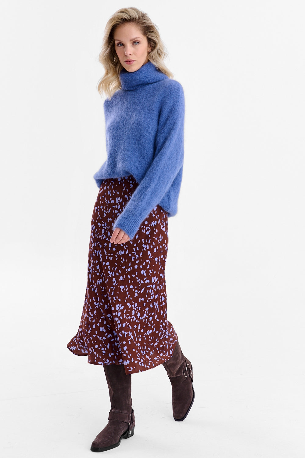 Spódnica midi Touch of Dusk to dowód na to, że codzienna elegancja nie musi być nudna. Wykonana w 100% z wiskozy, jest lekka i przewiewna. Krój w kształcie litery A delikatnie rozszerza się ku dołowi, zapewniając swobodę ruchów, a intrygujący print w drobne plamki ożywia każdą stylizację.