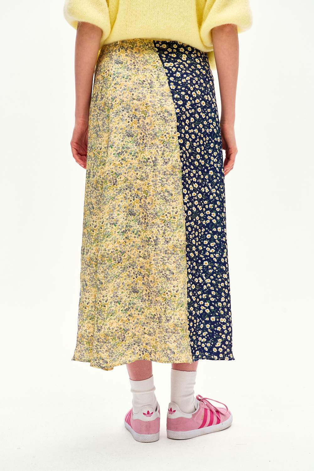 Spódnica midi Wild Daisy to propozycja dla kobiet, które kochają florystyczne motywy w nieszablonowym wydaniu. Połączenie delikatnych, jasnych kwiatów z wyrazistym, ciemnym wzorem tworzy dynamiczną i nowoczesną kompozycję, obok której nie da się przejść obojętnie.