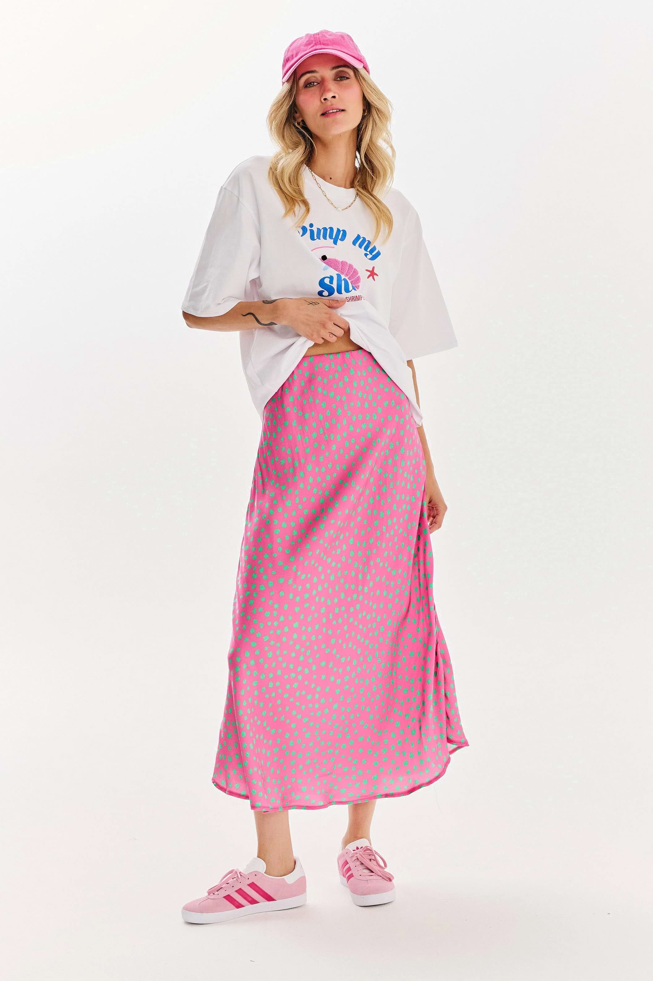 Spódnica Thunder Pink to propozycja, która sprawdzi się przy niezobowiązujących stylizacjach jak i tych bardziej formalnych. Wykonana z miękkiej tkaniny wiskozowej spódnica jest niezwykle lekka i przyjemna w dotyku. Różowo-zielony print w kropki to esencja romantyczności połączonej z klasyką. Ten model jest idealny dla kobiet, które lubią tradycyjne modele w nowym, szalonym wydaniu.