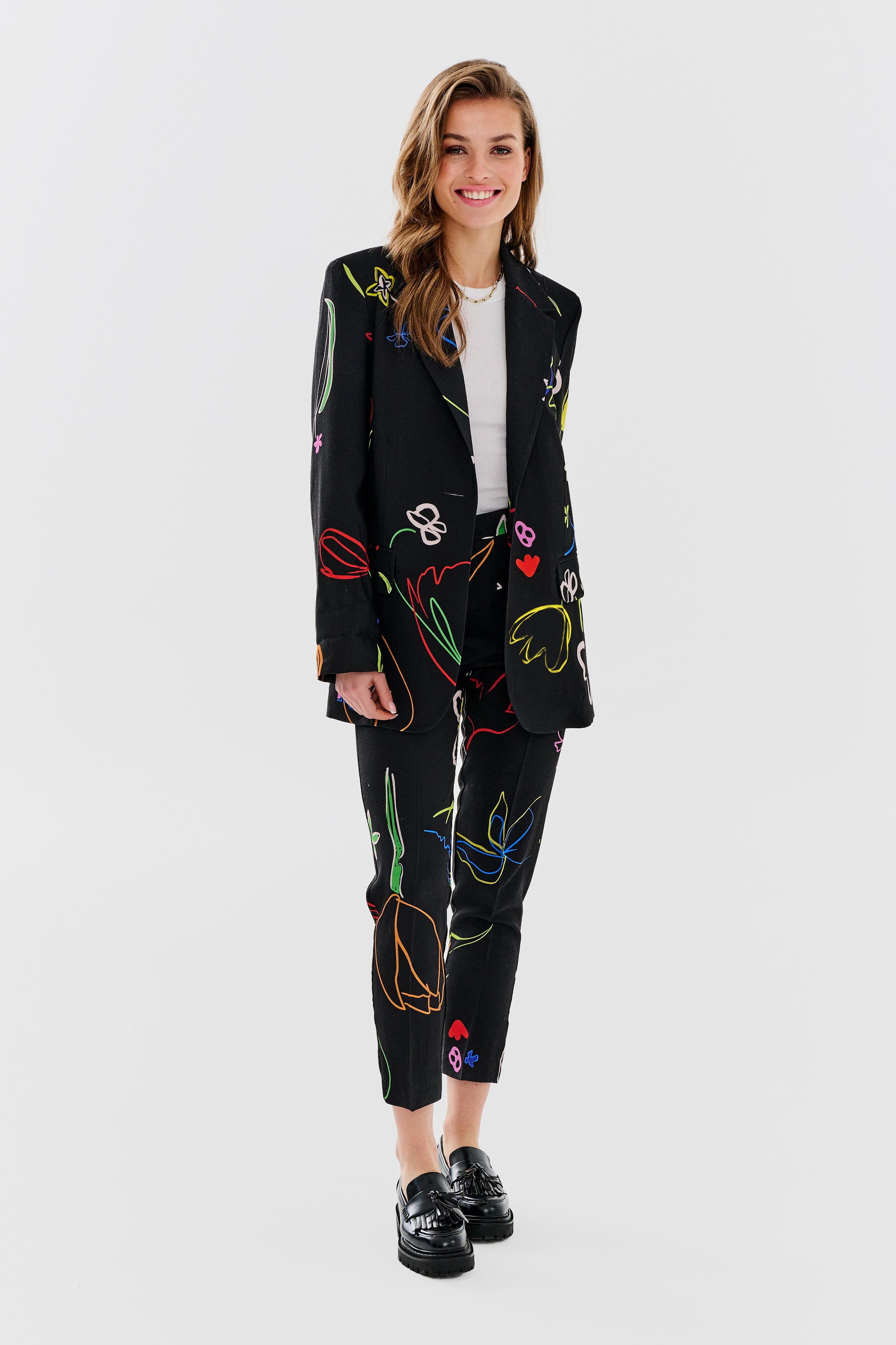 Spodnie Botanical stanowią esencję elegancji i wyrafinowanego gustu. Wzór w delikatne kwiaty nadaje spodniom subtelnej finezji, dodając im wyjątkowego uroku. Ponadczasowy czarny kolor sprawia, że spodnie będą pasować do wielu stylizacji.