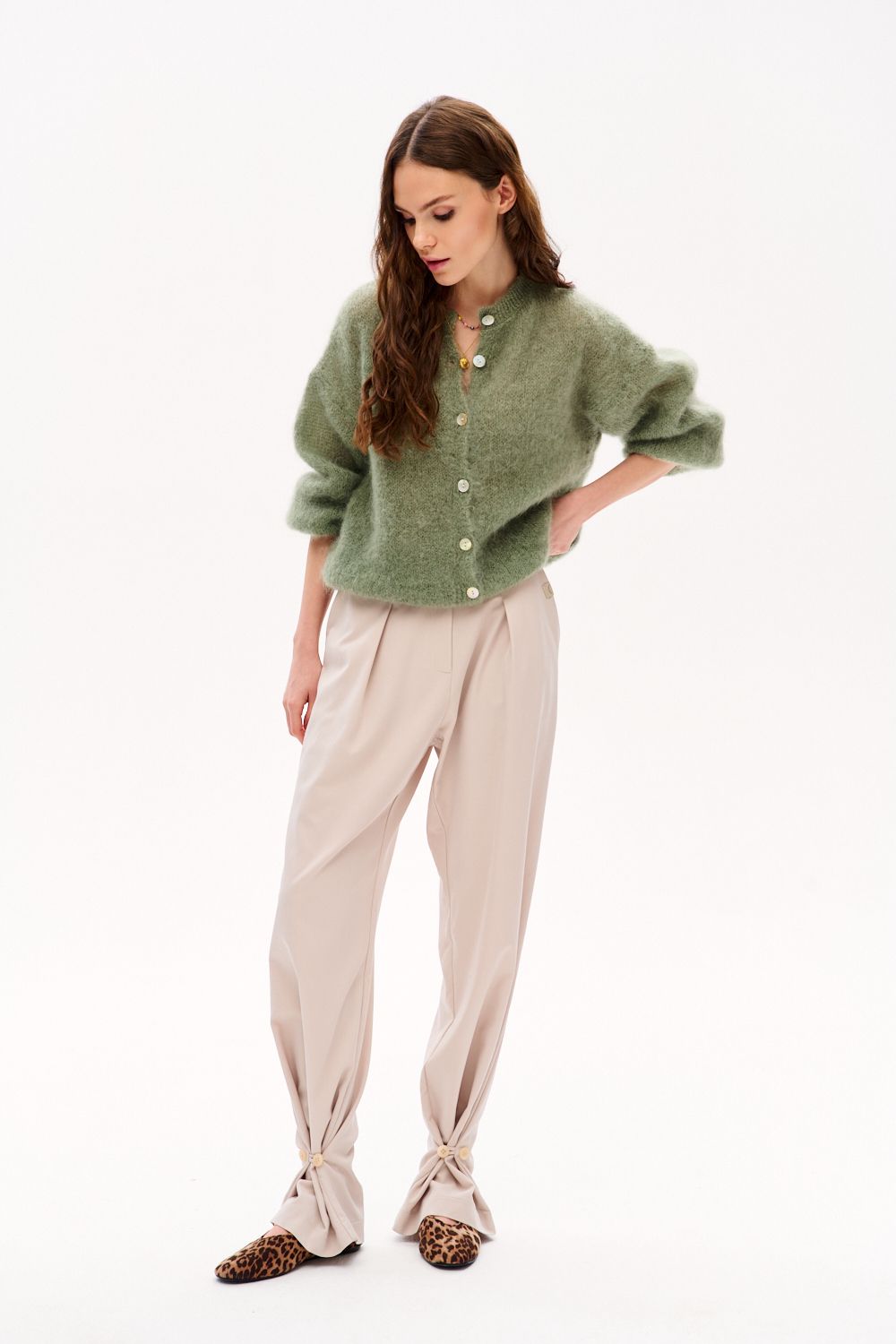 Spodnie City Sand to kwintesencja biurowego szyku w nowoczesnym wydaniu. Prosta nogawka zakończona subtelnym marszczeniem i ozdobnym guzikiem nadaje im unikalnego, designerskiego wyrazu.