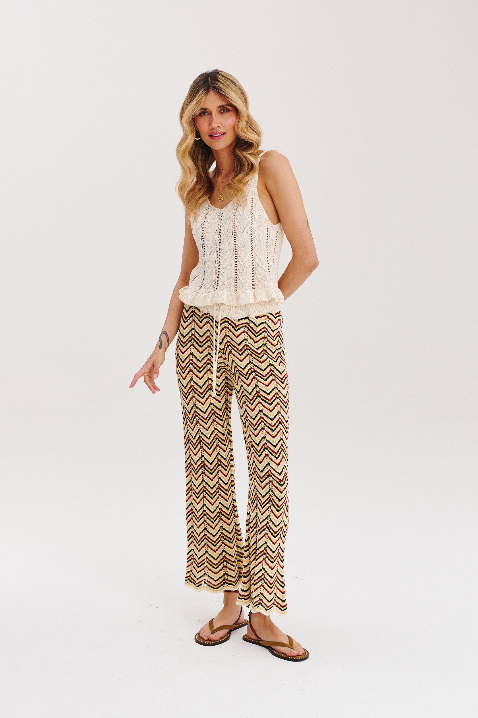 Zanurz się w rytmie wolności i wygody ze spodniami crochet Whispering Dunes. To wyjątkowy model, który łączy przyjemny materiał z letnim luzem i boho energią. Ażurowy splot w zygzakowy wzór przyciąga wzrok, a wielobarwna paleta kolorów nawiązuje do wschodów i zachodów słońca nad pustynnymi wydmami.