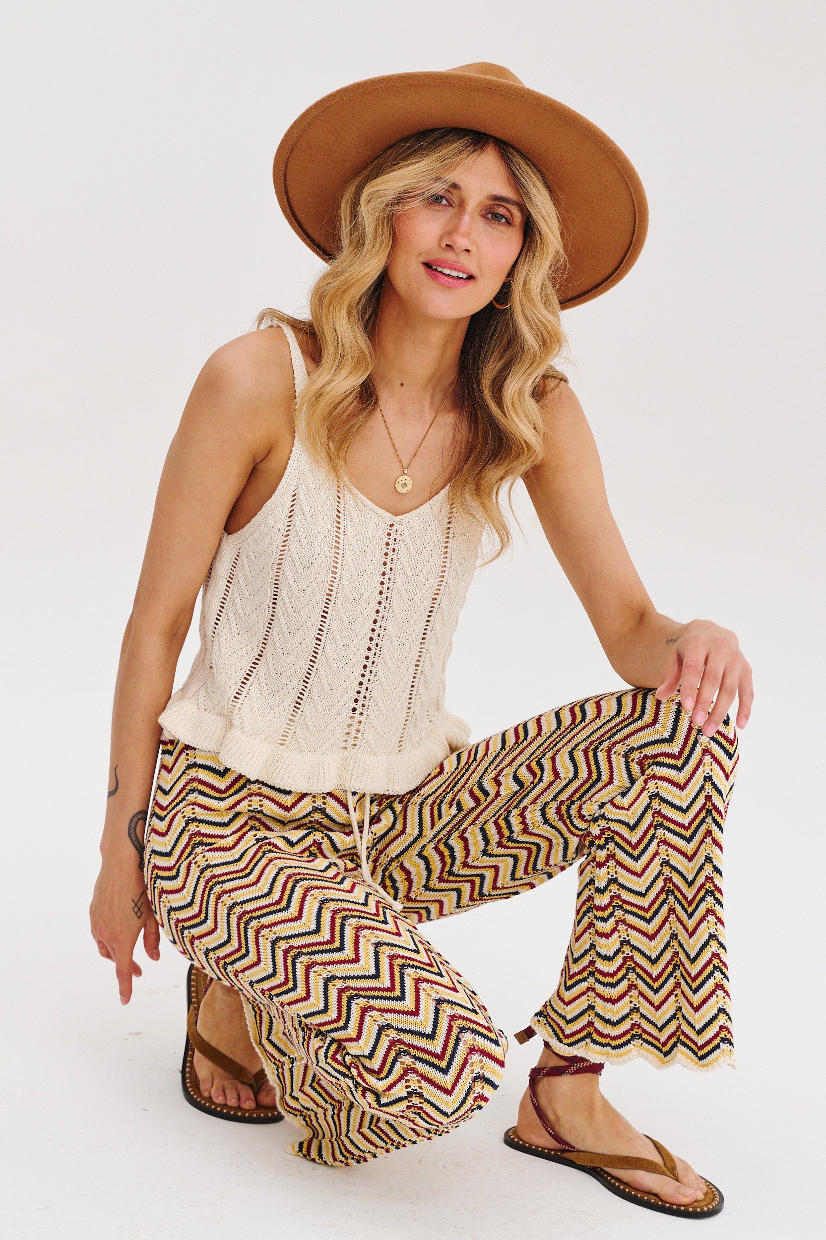 Zanurz się w rytmie wolności i wygody ze spodniami crochet Whispering Dunes. To wyjątkowy model, który łączy przyjemny materiał z letnim luzem i boho energią. Ażurowy splot w zygzakowy wzór przyciąga wzrok, a wielobarwna paleta kolorów nawiązuje do wschodów i zachodów słońca nad pustynnymi wydmami.