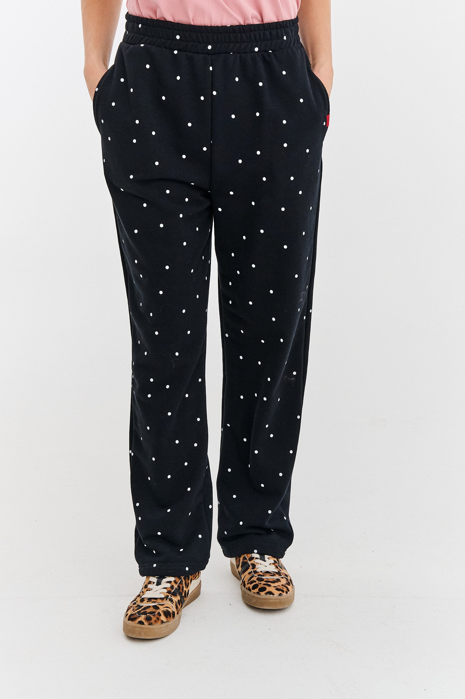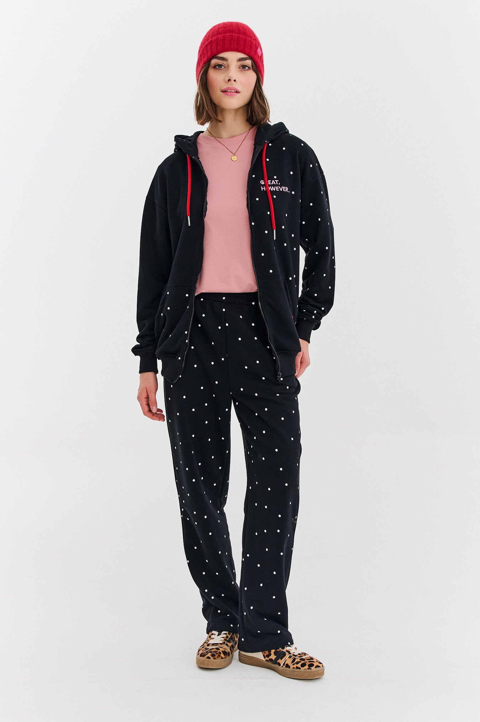 Spodnie dresowe Not Too Bad to dowód na to, że dresy nie muszą być nudne. To propozycja dla kobiet, które cenią sobie luz, ale nie chcą rezygnować z wyrazistego stylu. Klasyczna czerń stanowi idealne tło dla setek małych, białych kropek