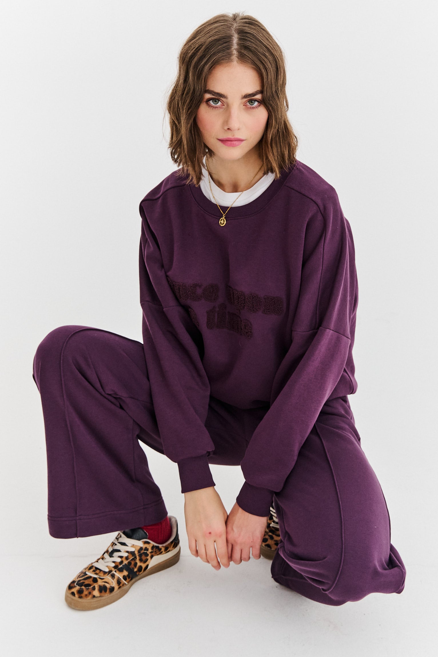 Spodnie zostały wykonane z miękkiej, wysokogatunkowej dzianiny w szlachetnym, śliwkowym odcieniu. Dyskretny, bajkowy haft na kieszeni to uroczy detal. Noś spodnie razem, z bluzą Once Upon a Time.